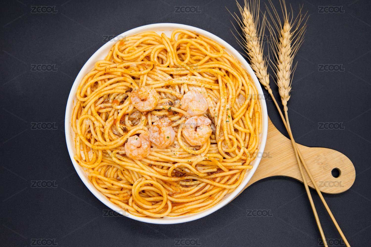 木桌上的一盤海鮮意大利面