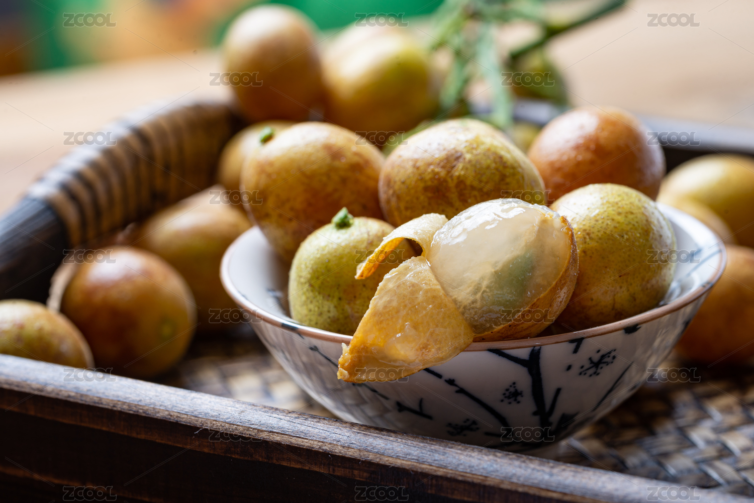 木桌上擺放的藤編托盤里的水果黃皮果