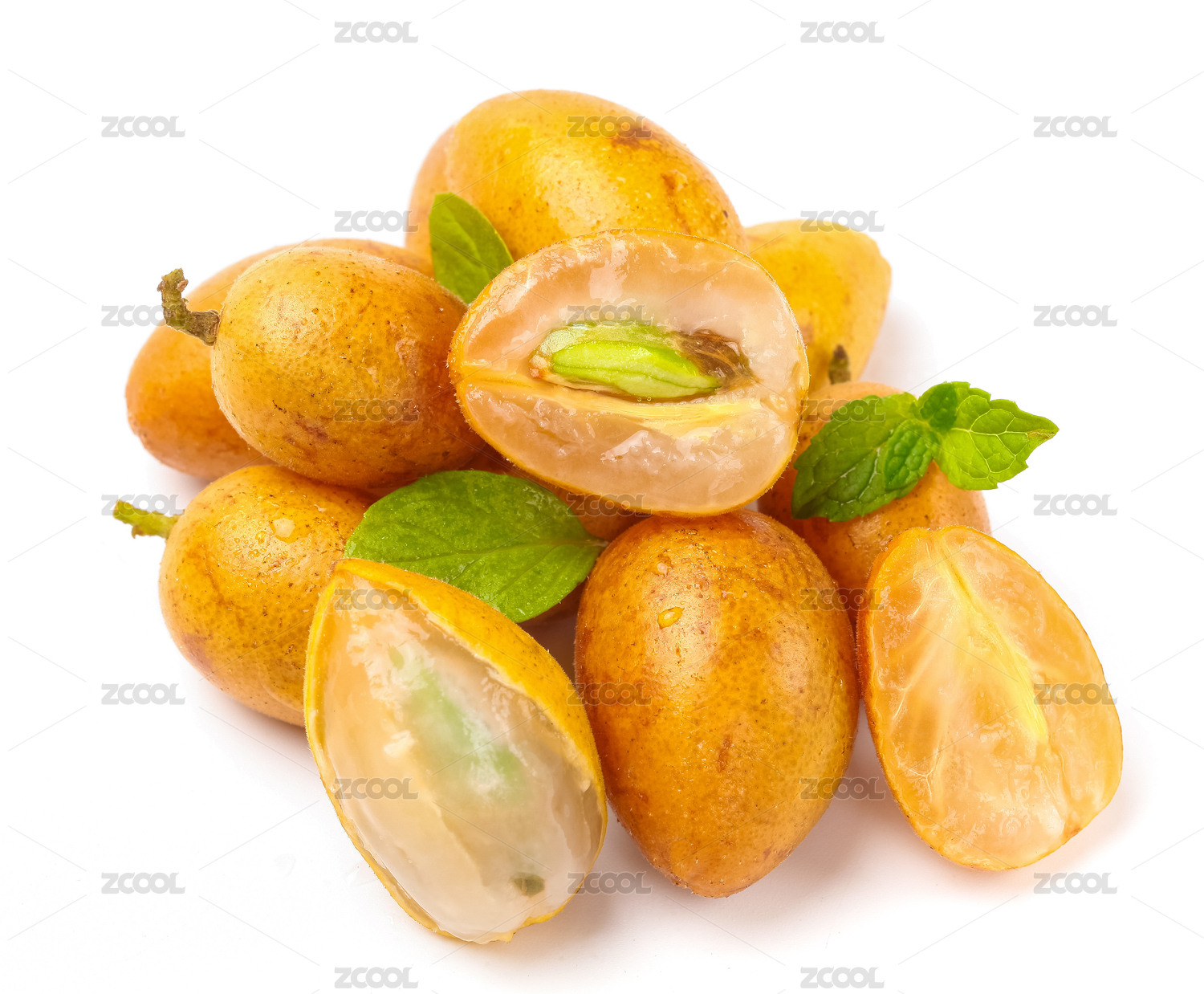 白底上的黃皮組合,三個切開的黃皮果肉
