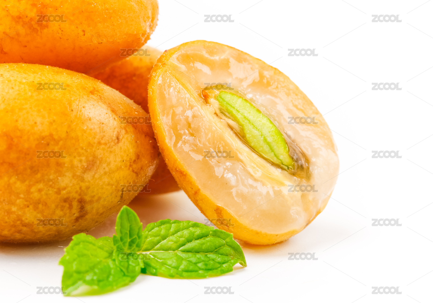 白底上的兩個黃皮,一個剝皮的黃皮,一個切開的黃皮