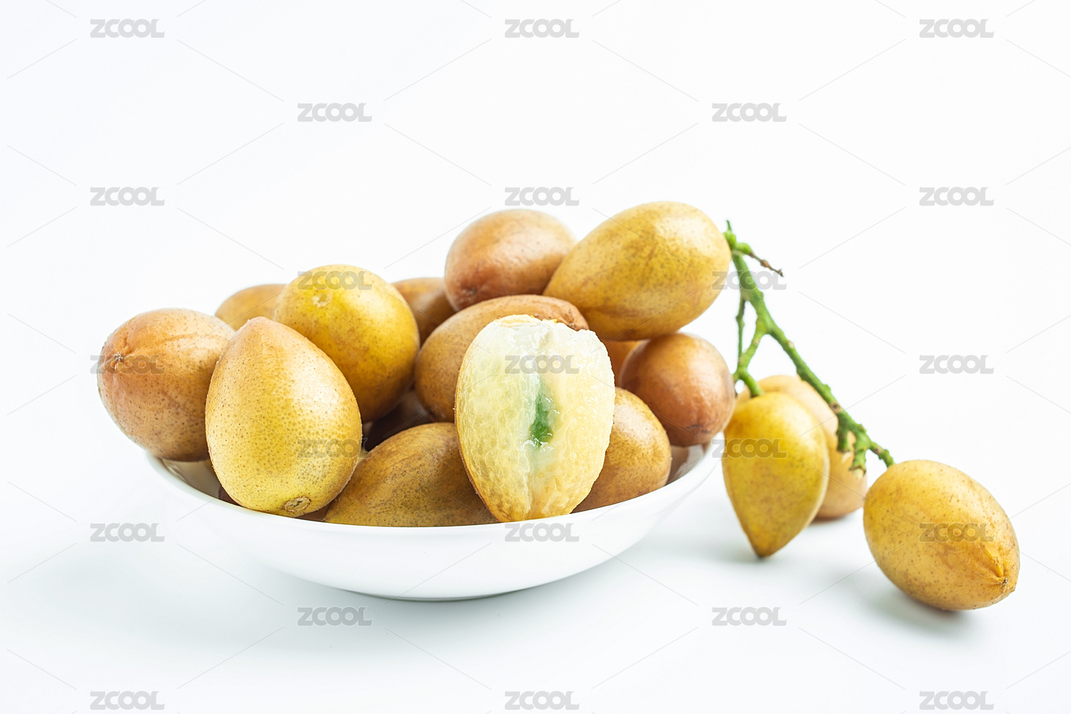 三個白底上的黃皮,一個切開的黃皮,兩個完整的黃皮