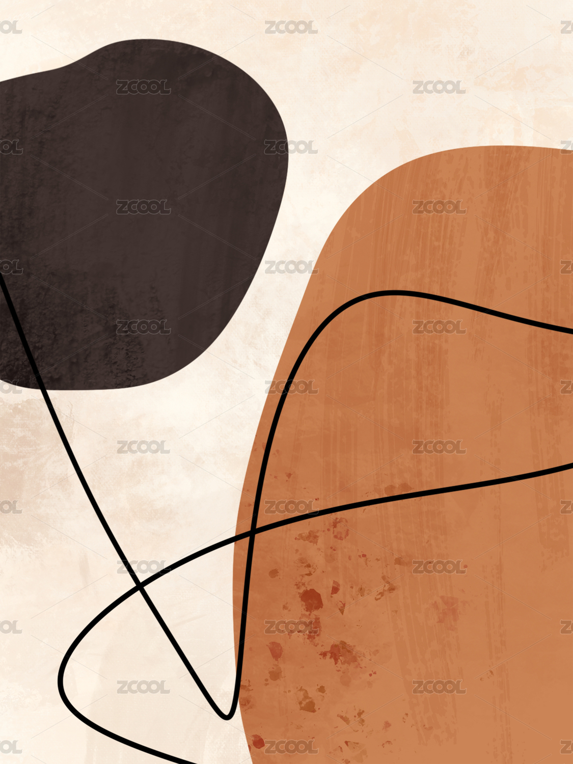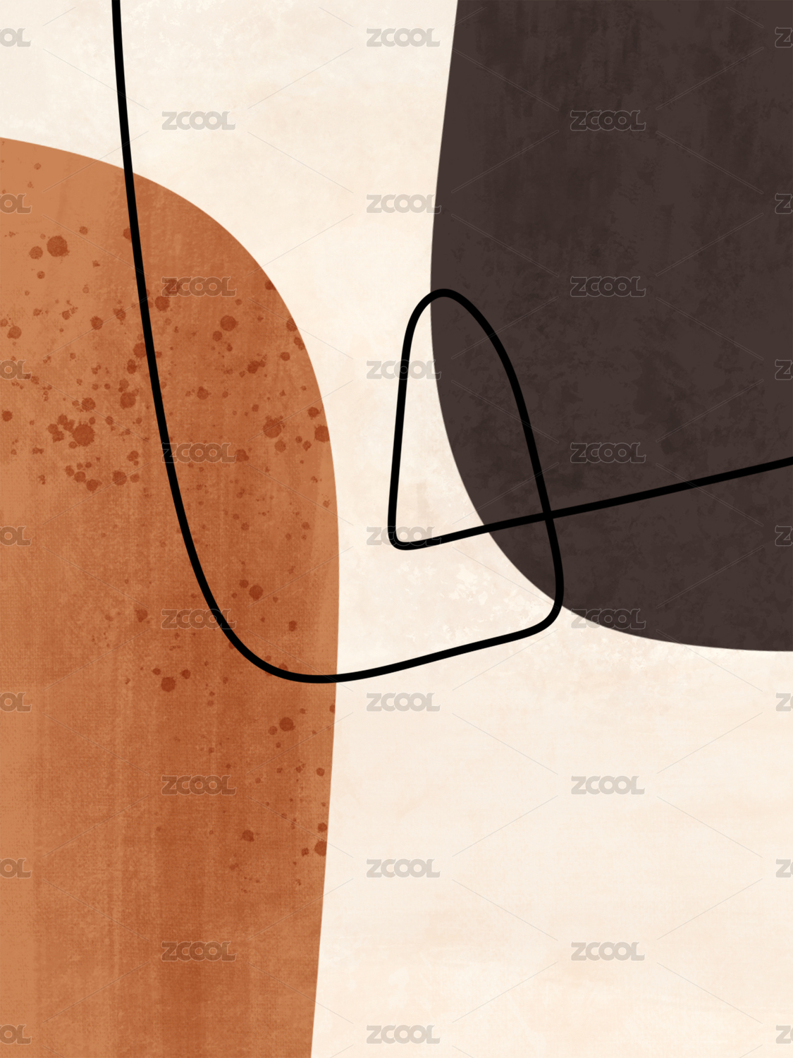 暖橙和深棕色塊之間穿插線條的暖色調裝飾畫