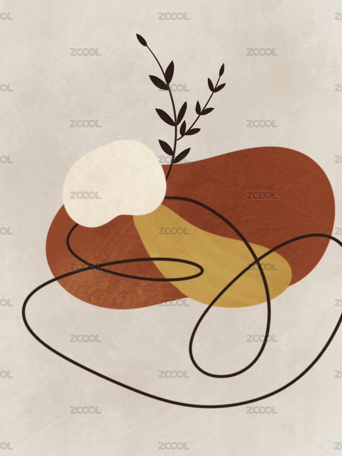 紅棕和橙黃塊的暖色調裝飾畫里有植物和線條