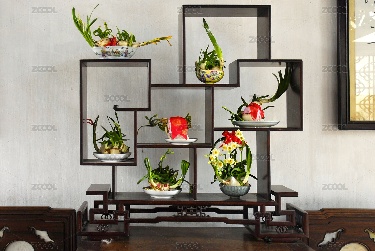 中國蘇州園林留園 室內博古架水仙花盆景
