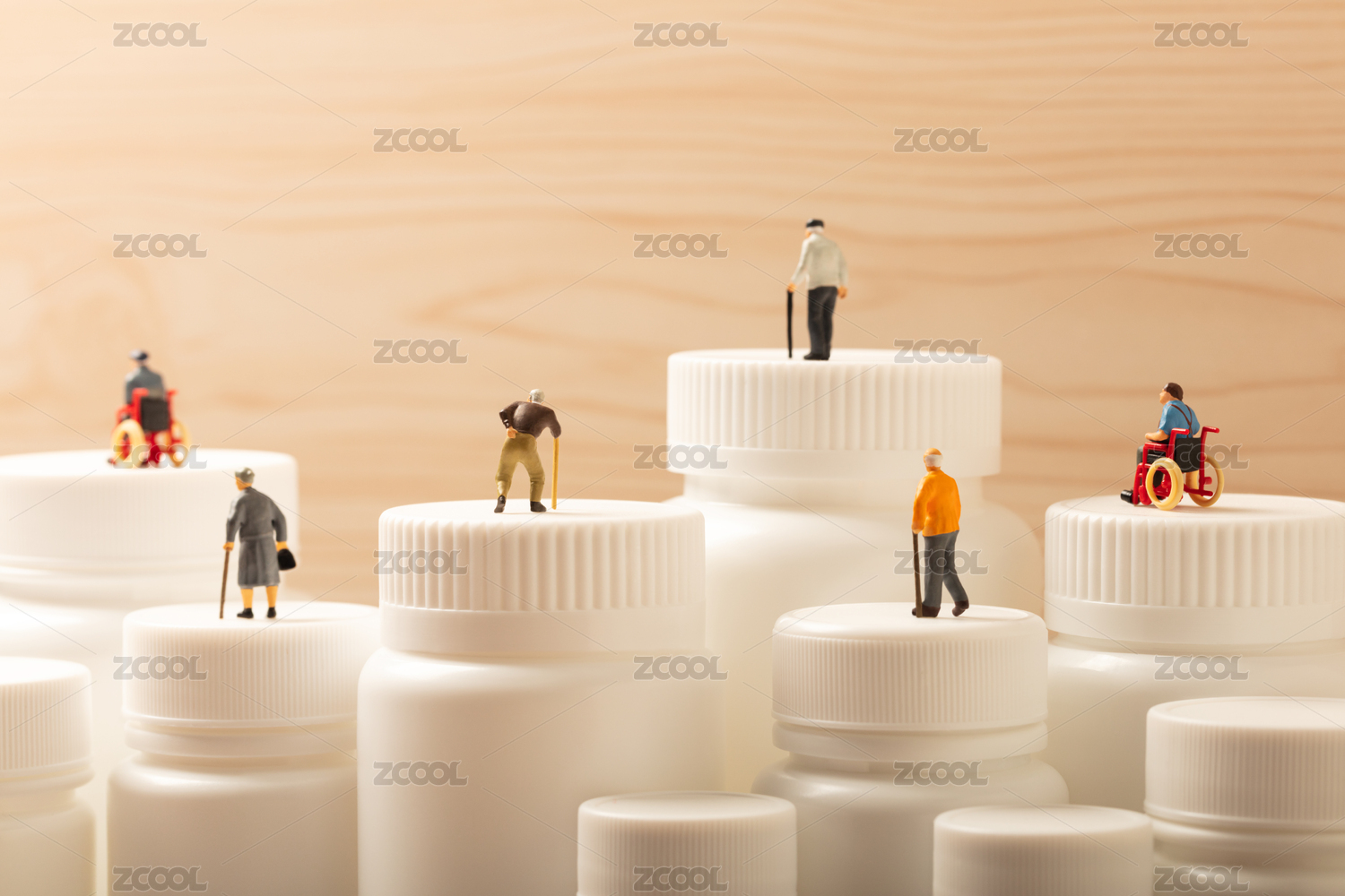 微縮創(chuàng)意大量白色藥瓶上的老年人醫(yī)療健康