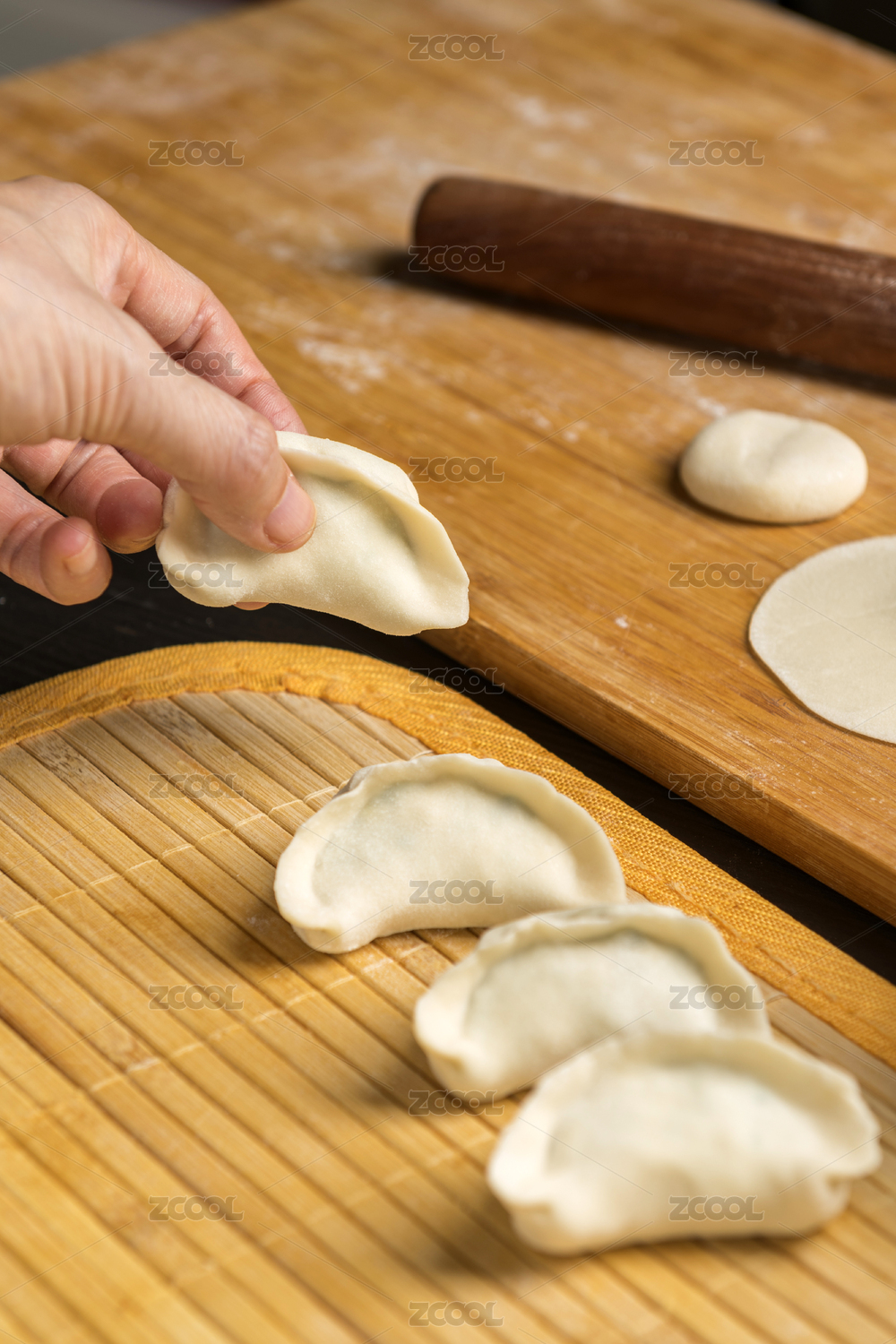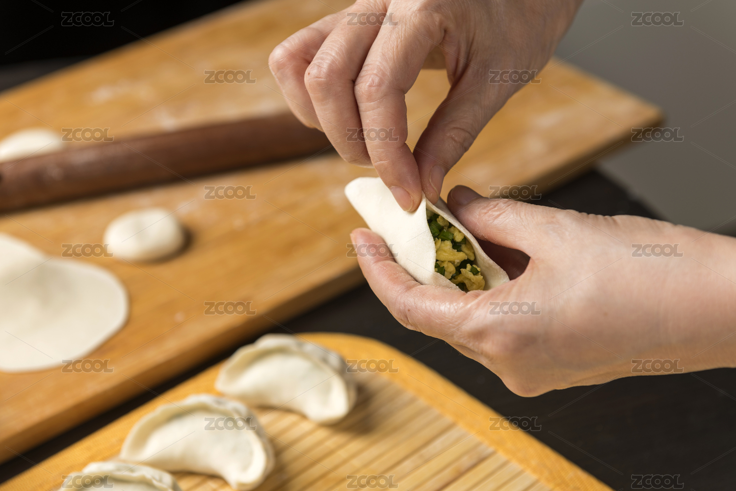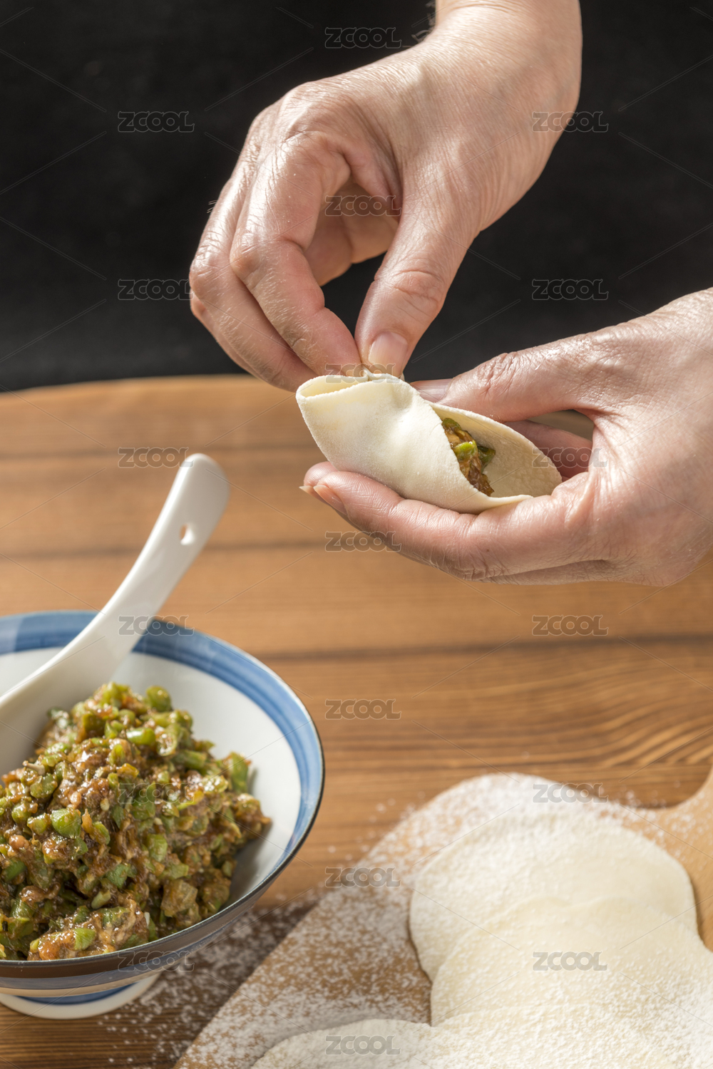 女性雙手正在包餃子特寫木桌面背景