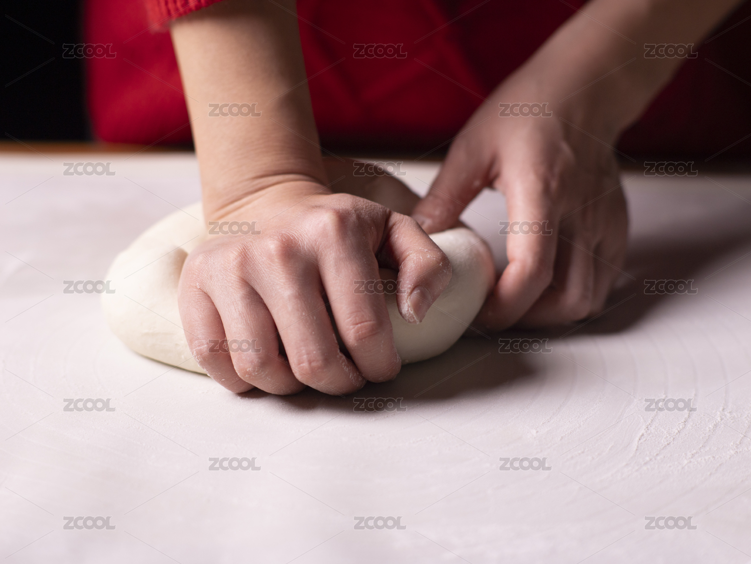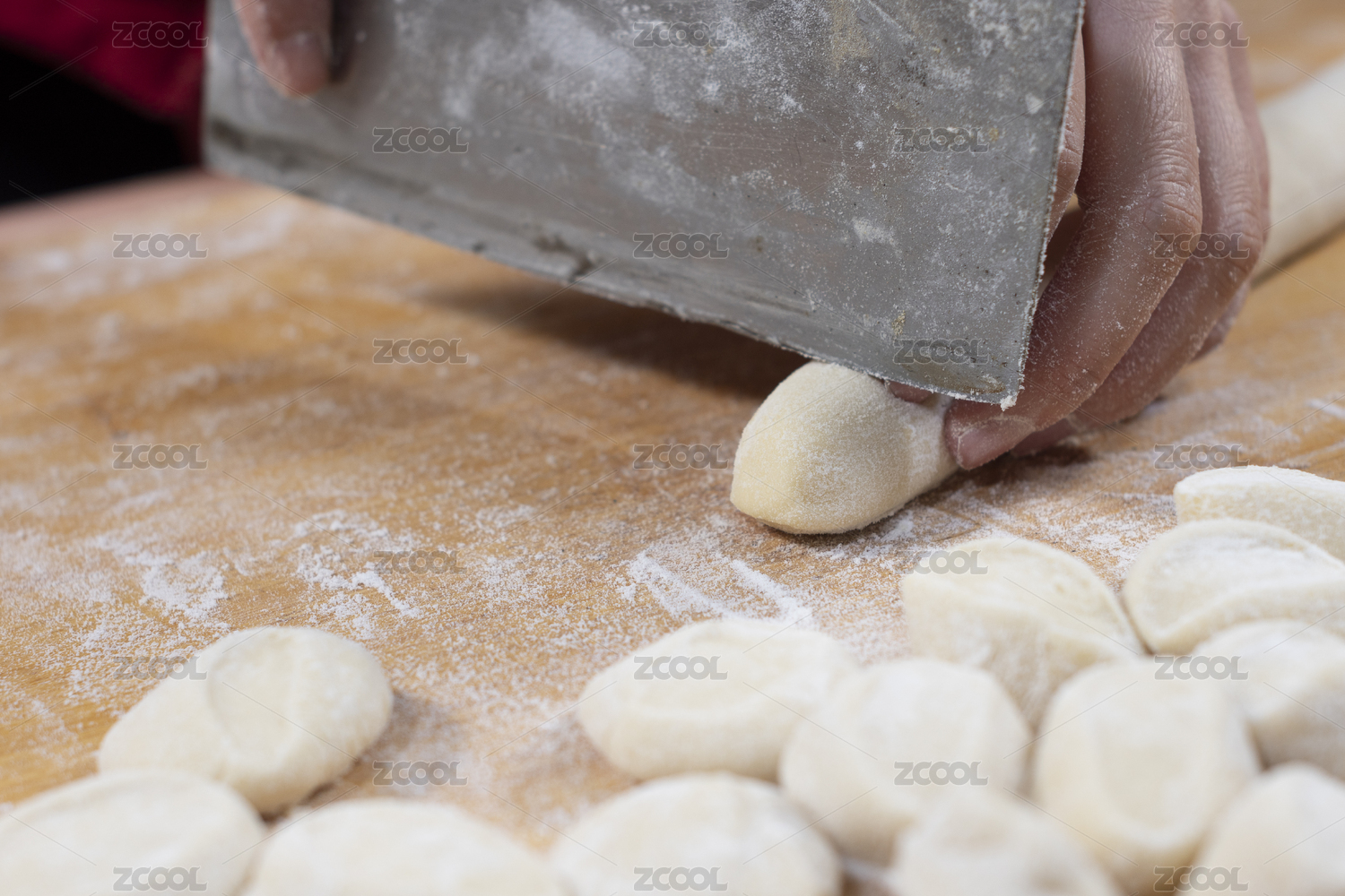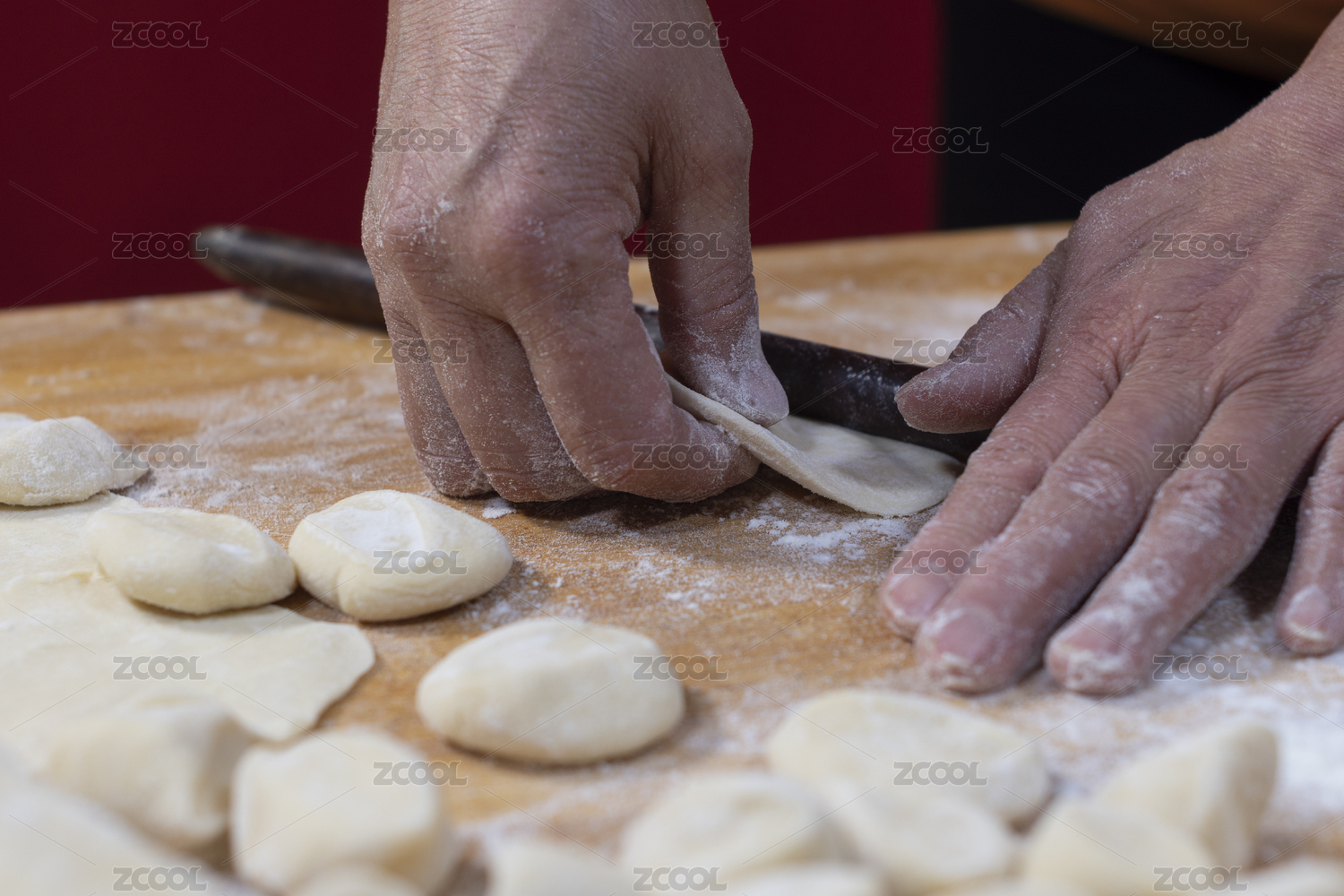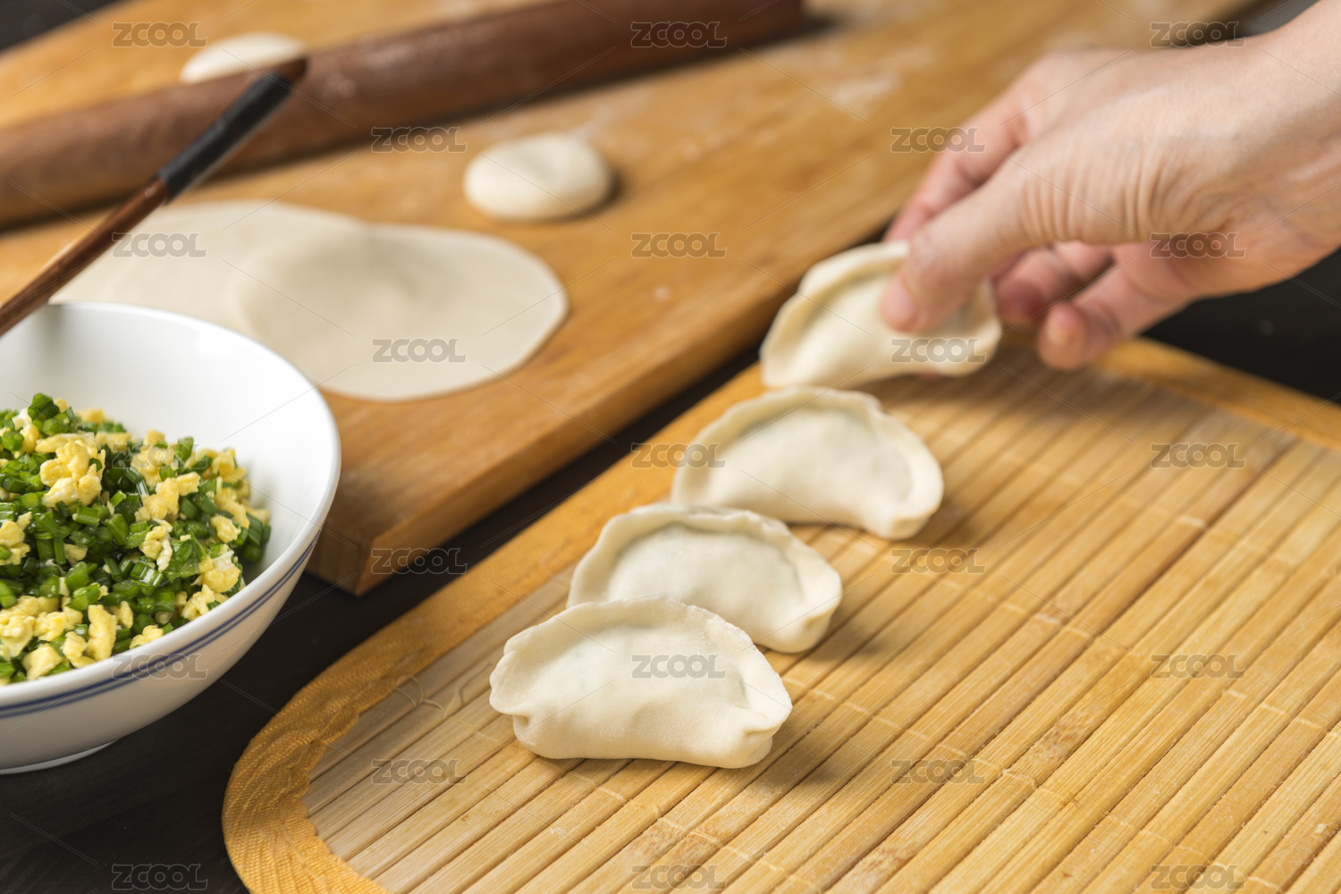 女性雙手正在包餃子特寫木桌面背景