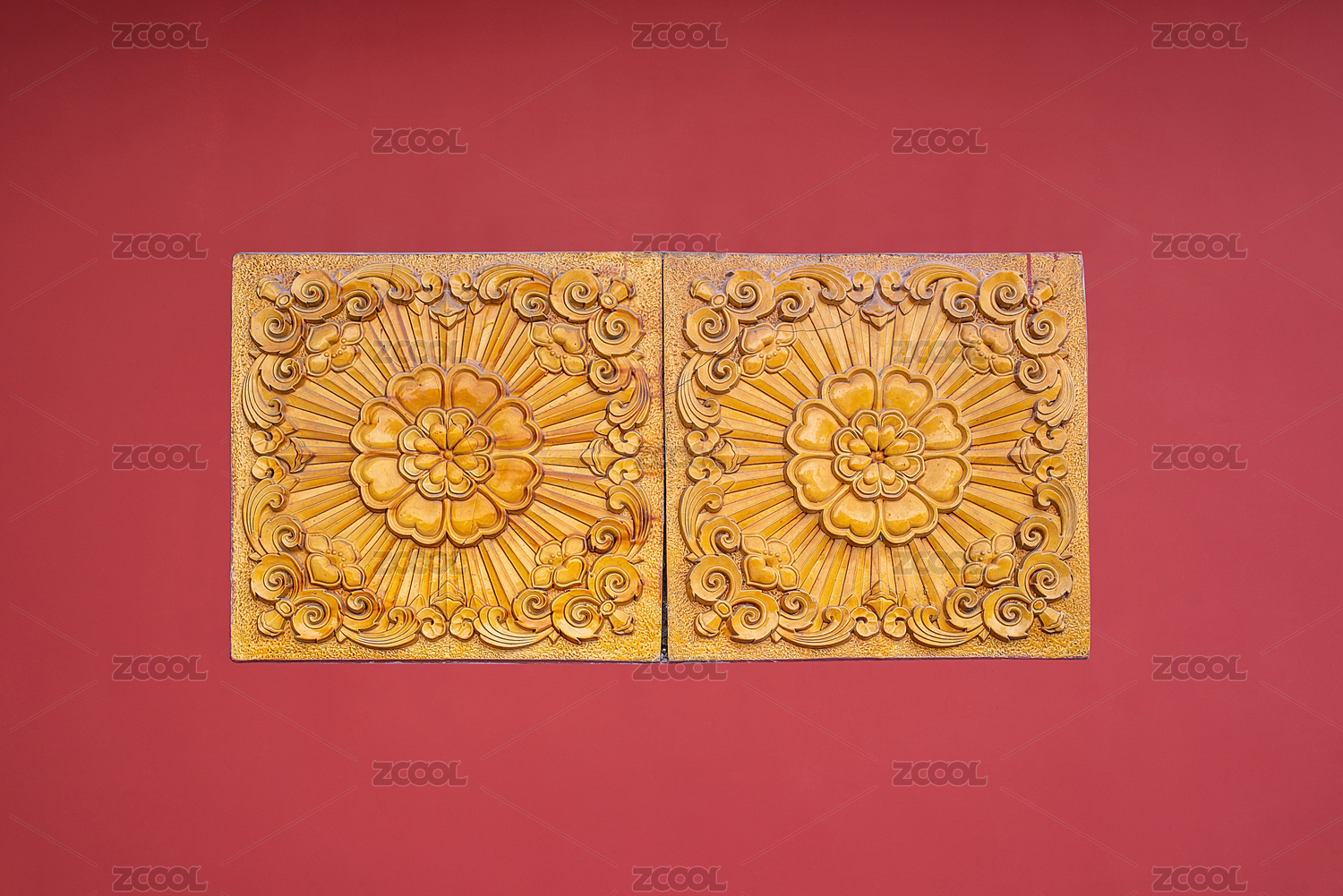 中國(guó)廣東省佛山祖廟古建筑紅圍墻上的花卉浮雕陶瓷磚