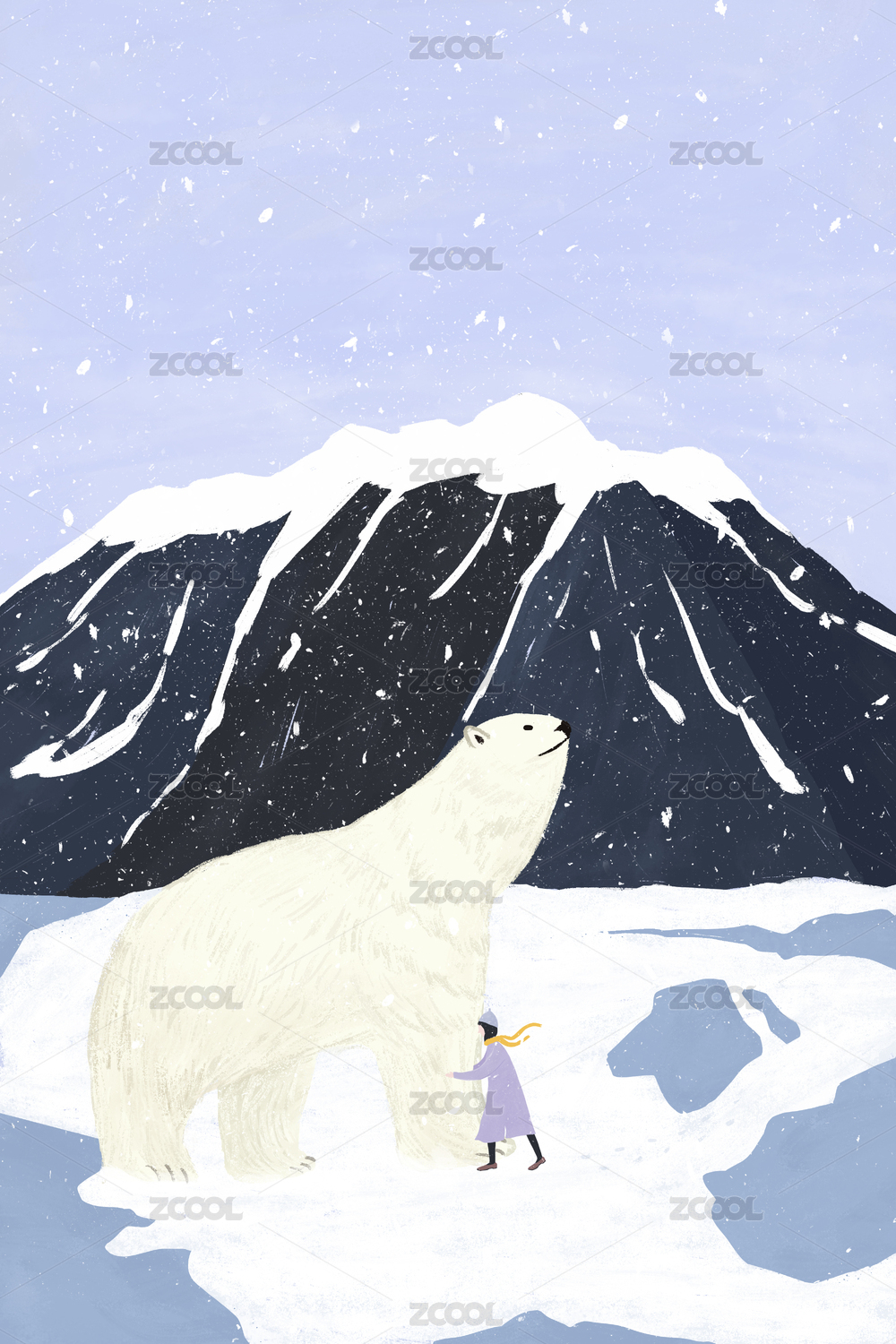 穿著大衣的女孩在雪地上和北極熊擁抱