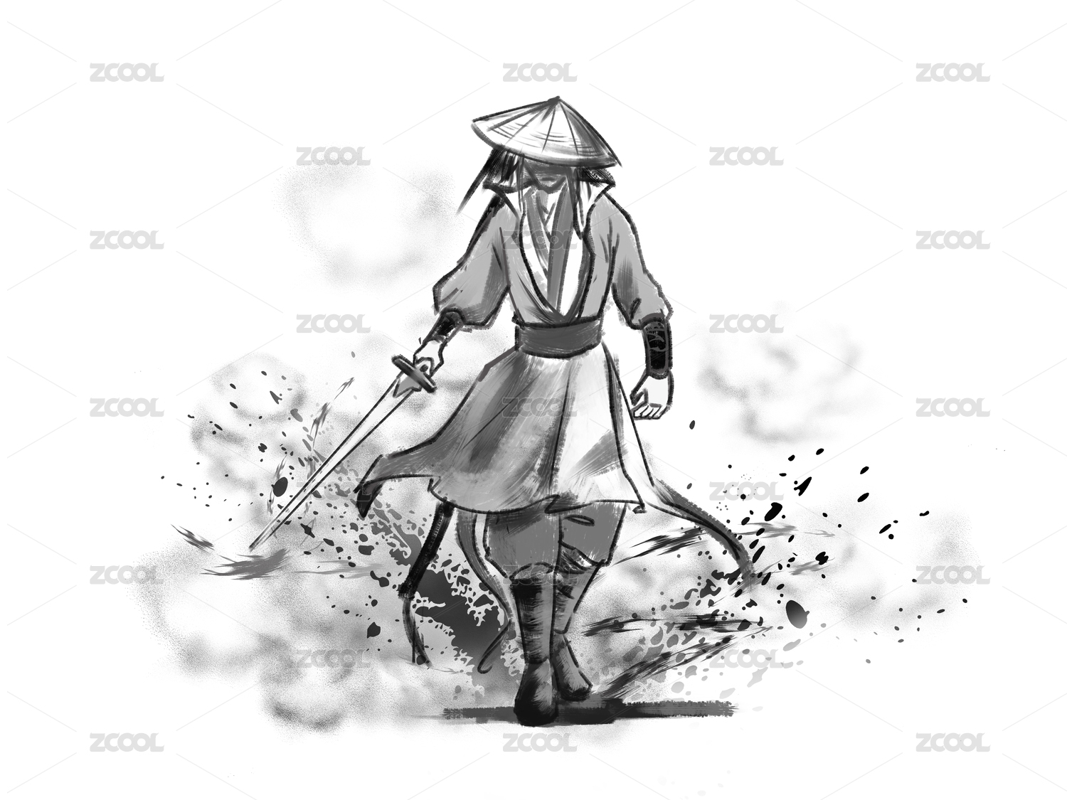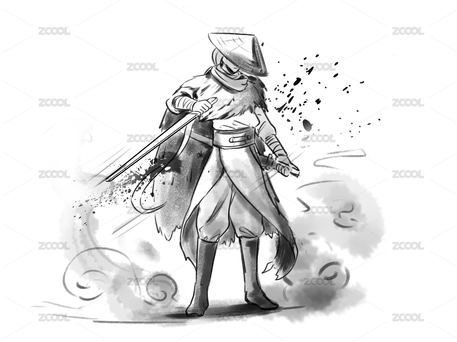 黑白漫畫水墨風(fēng)白煙刀劍草帽俠客人物元素