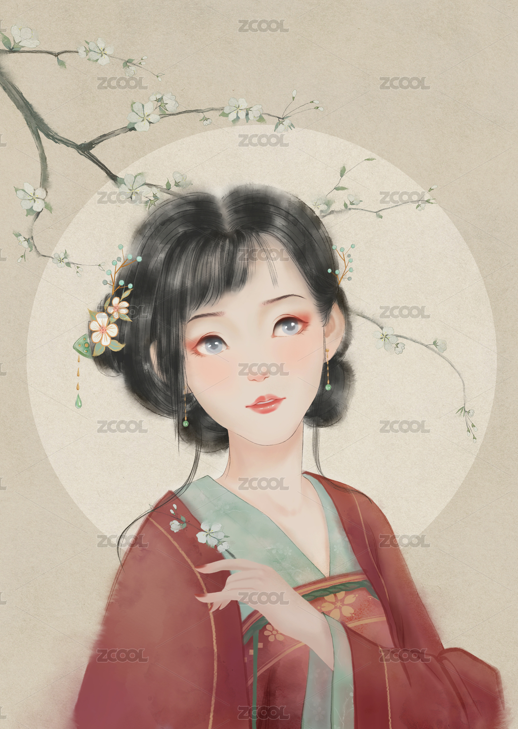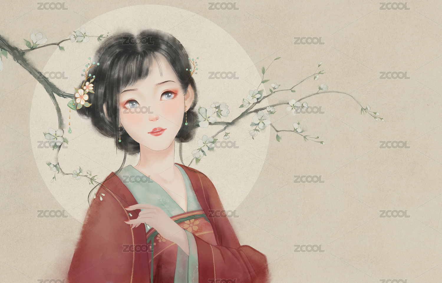 水墨風(fēng)樹下紅衣少女