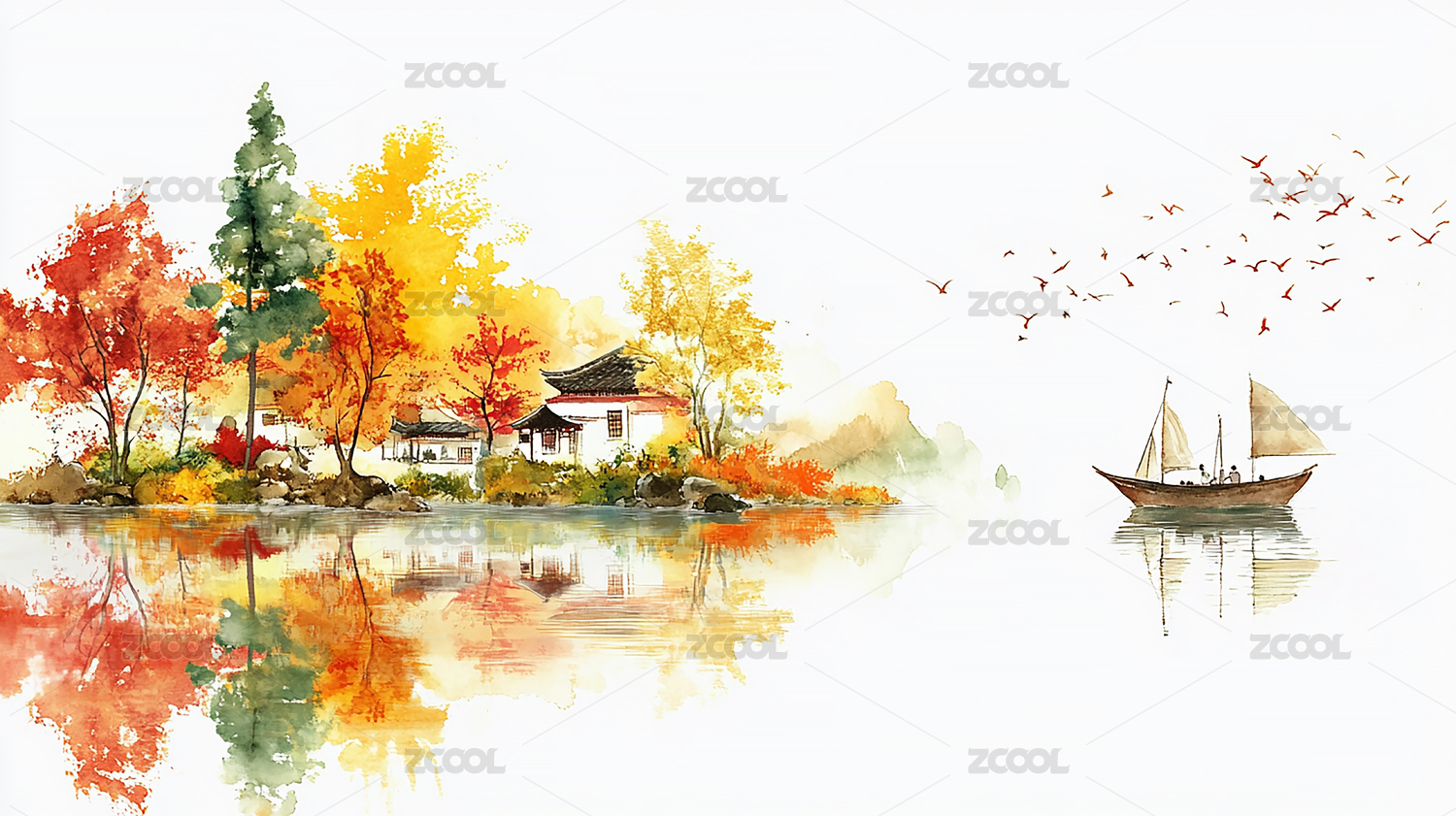 水墨風(fēng)江南水鄉(xiāng)建筑黃色的楓樹