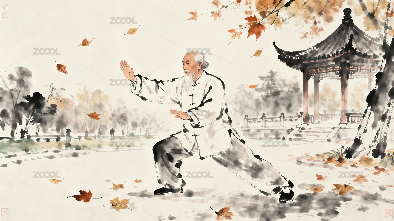 重陽節(jié)老人在公園打太極水墨風(fēng)格插畫