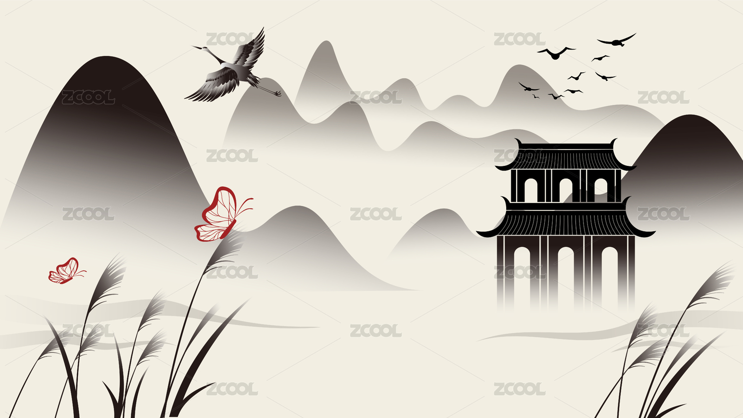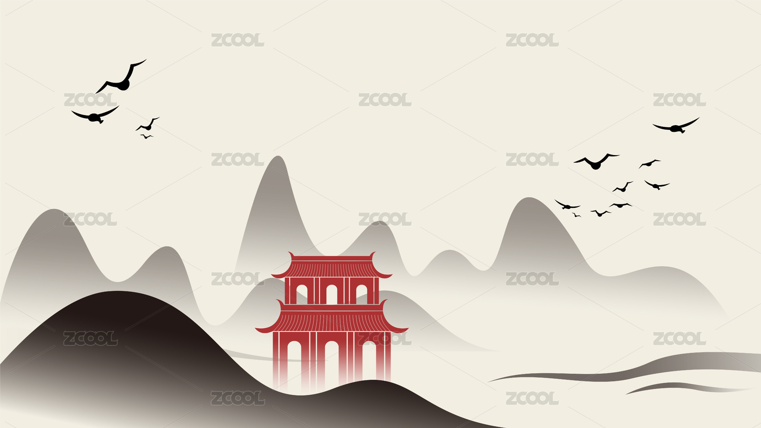 水墨中國風(fēng)矢量山水背景手繪插畫