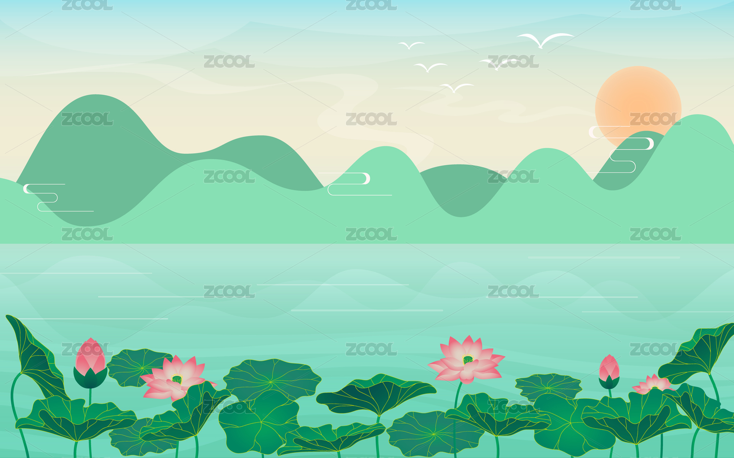 夏天荷花山水矢量背景
