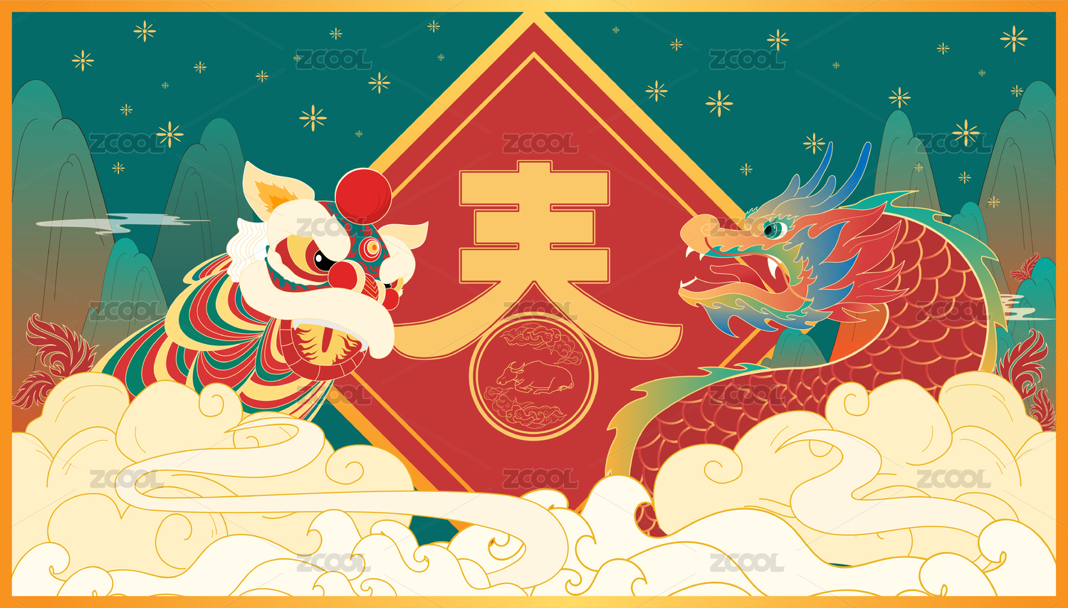 2021牛年新春國風(fēng)舞龍舞獅插畫