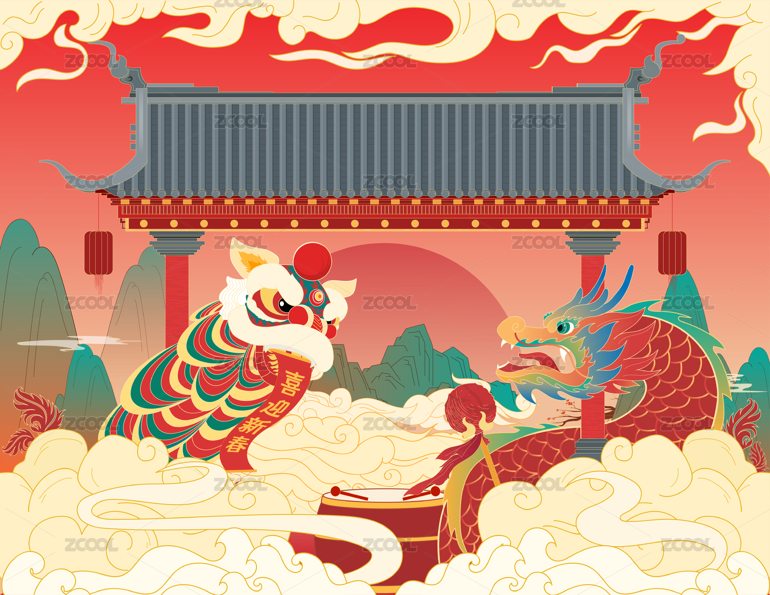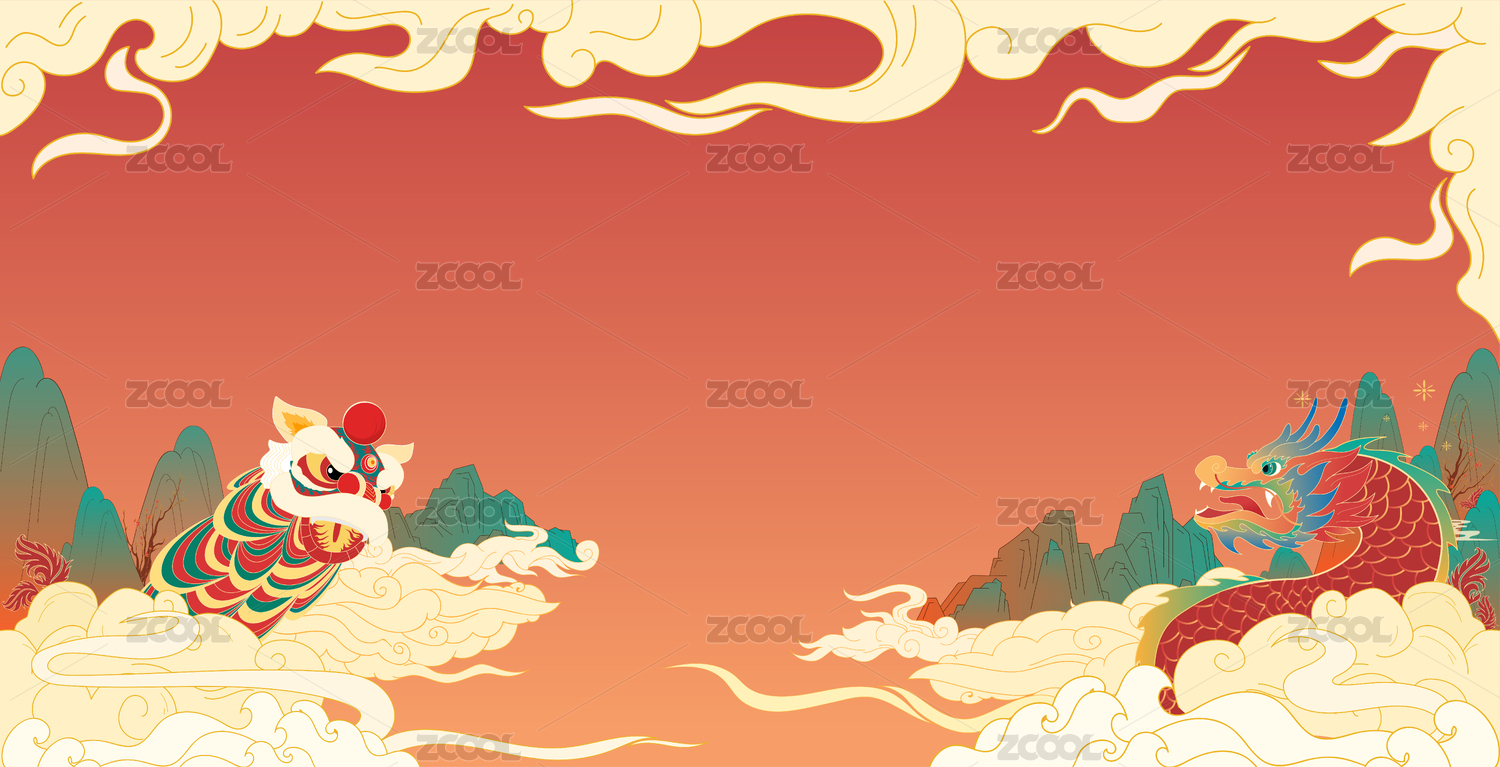 新春龍獅共舞迎新年國風(fēng)插畫