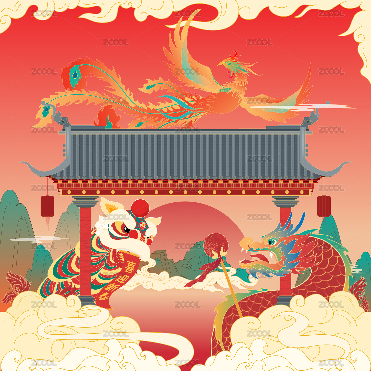 喜迎新春新年喜慶舞獅龍飛鳳舞國風(fēng)插畫