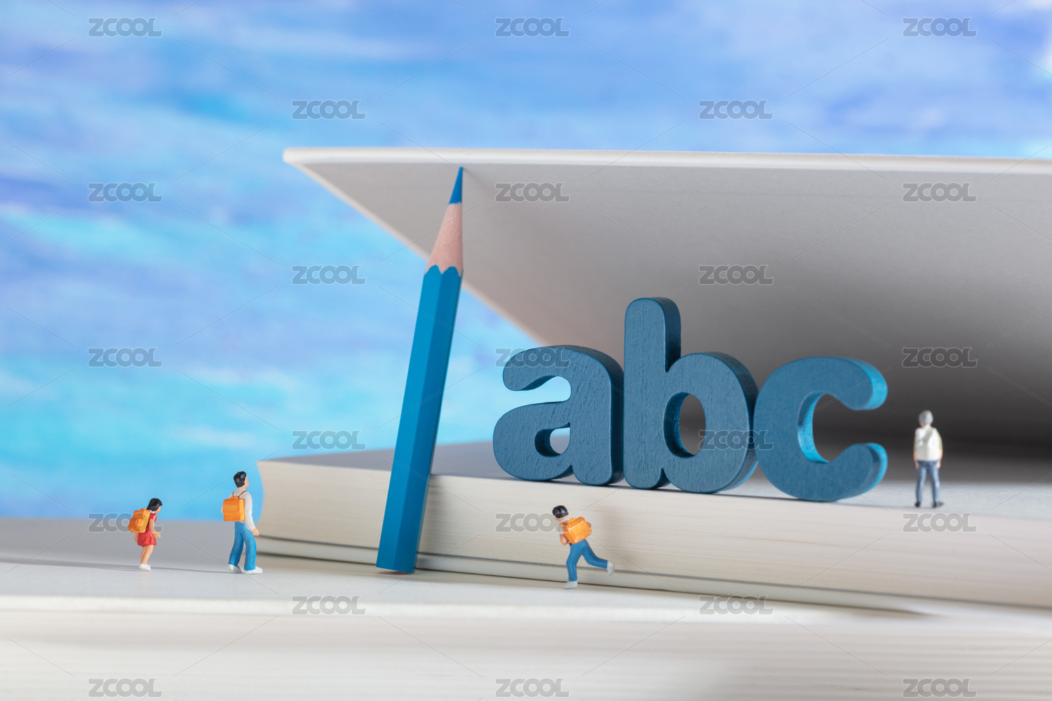 微縮創(chuàng)意書本上的字母abc和學(xué)英語的學(xué)生