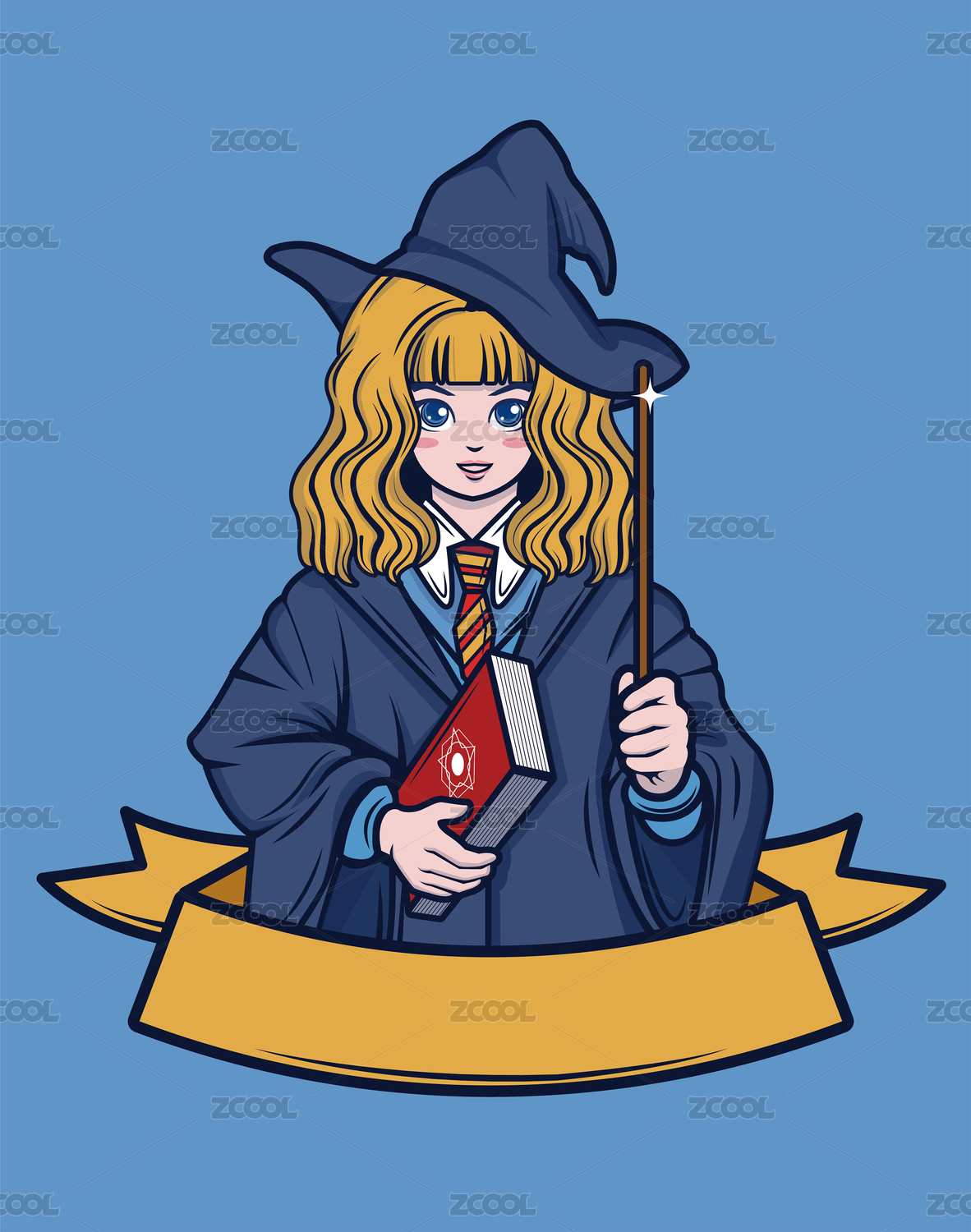 卡通風(fēng)女孩萬圣節(jié)戴著魔法帽拿著掃把插畫