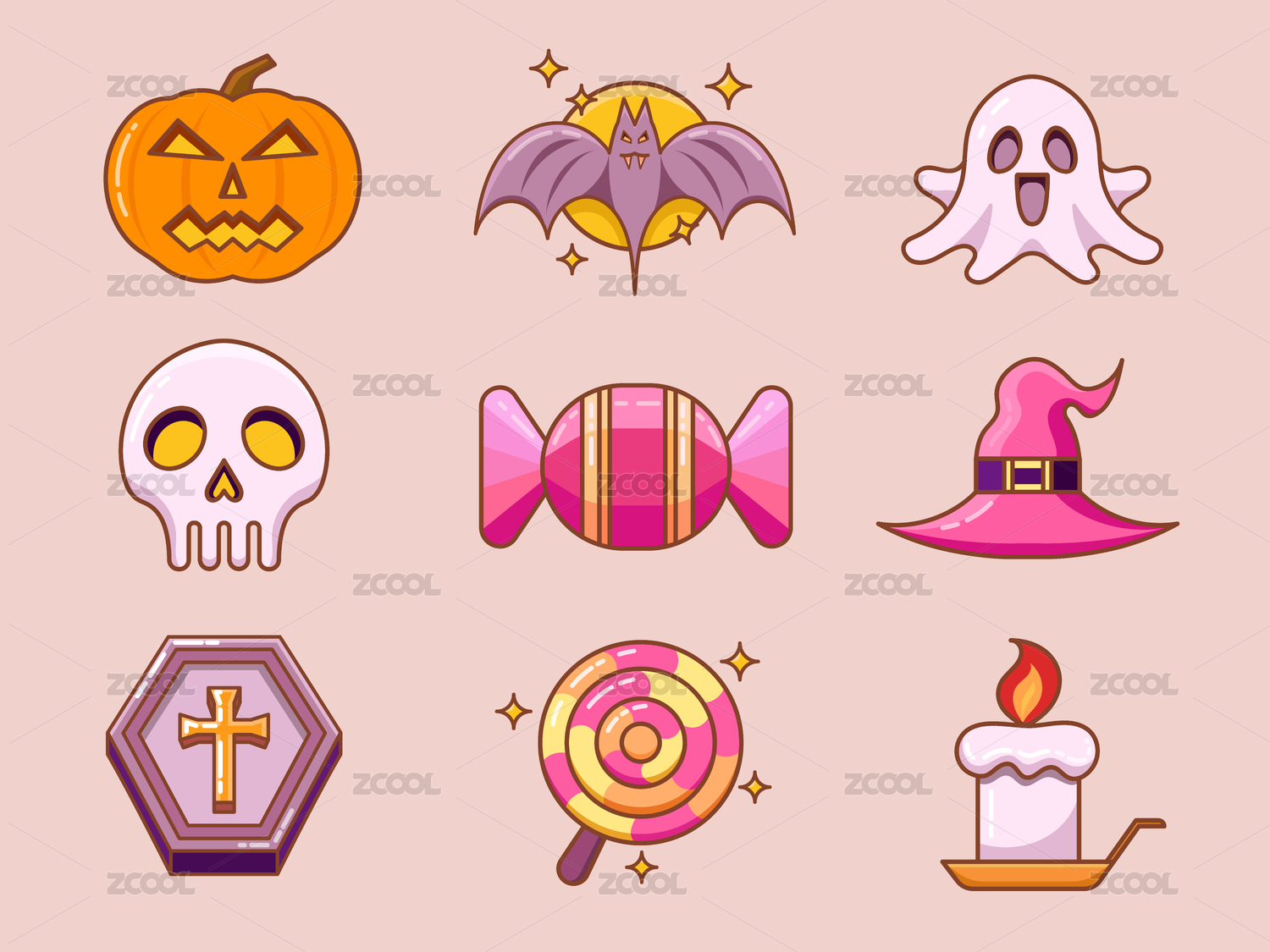南瓜怪蝙蝠魔法帽蠟燭萬圣節(jié)描邊風(fēng)圖標(biāo)