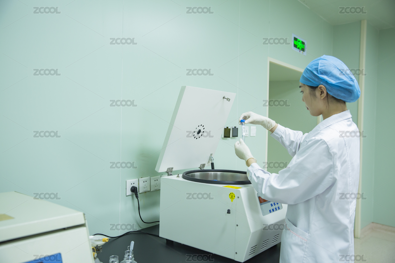 藍(lán)色綠色的試管在離心機(jī)中離心分析,生物科技,研究測(cè)試的概念。