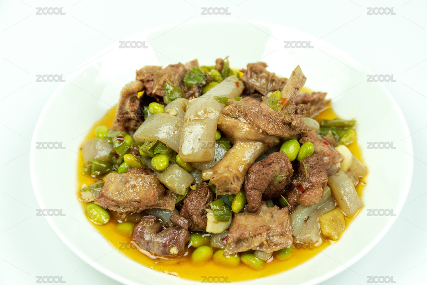圓盤子里盛放著的葷菜魔芋燒鴨