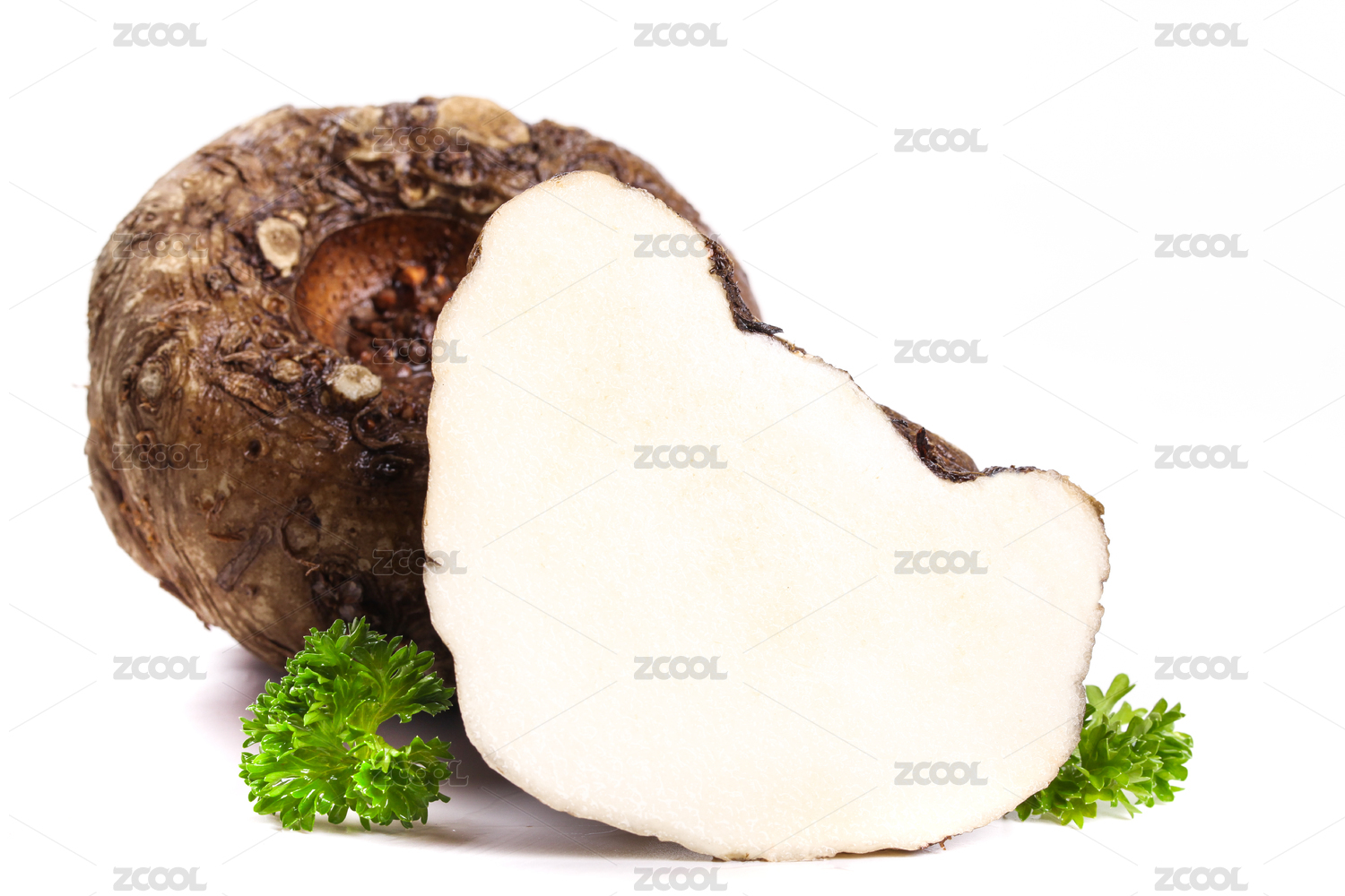 白底上放著一個完整的魔芋和半邊切面鮮魔芋