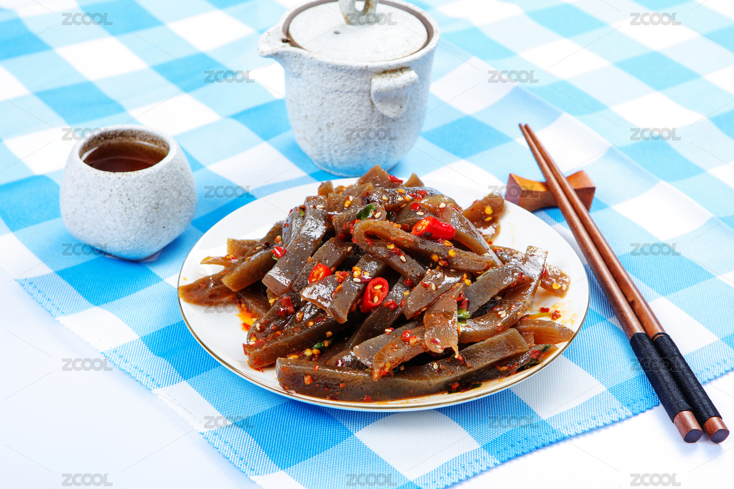 桌面上的盤子里的美味可口的魔芋爽