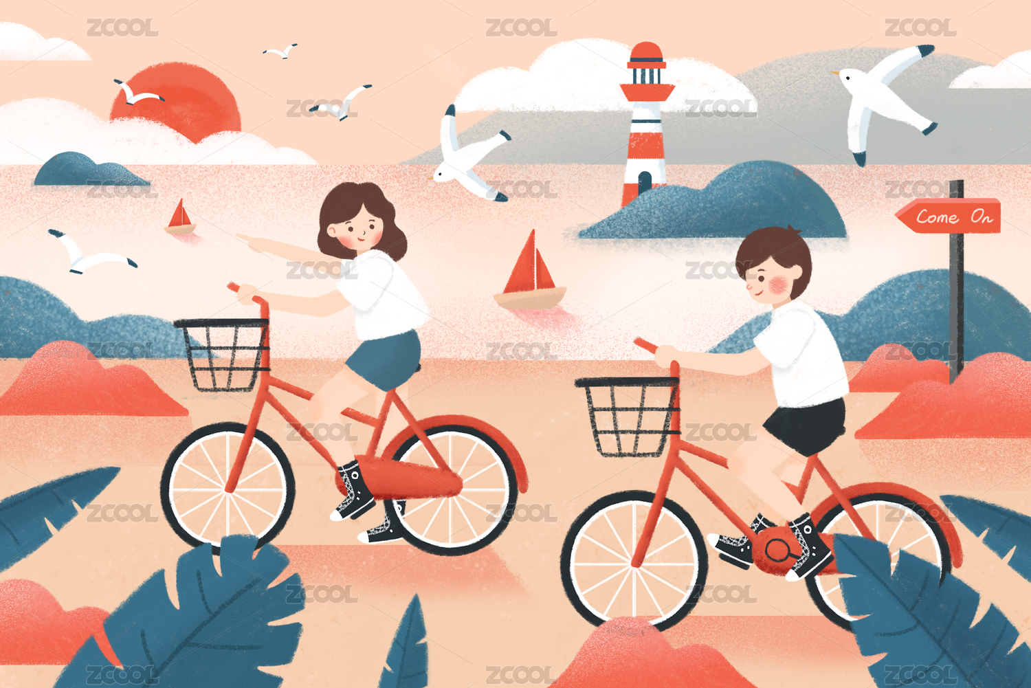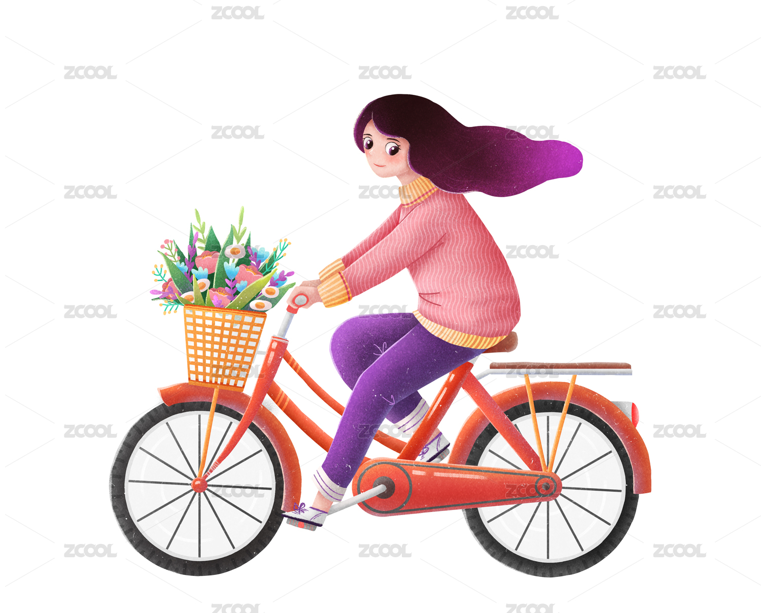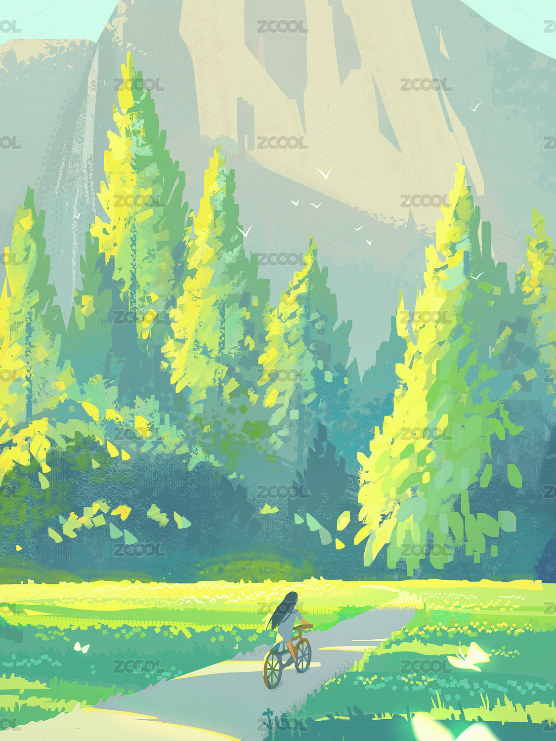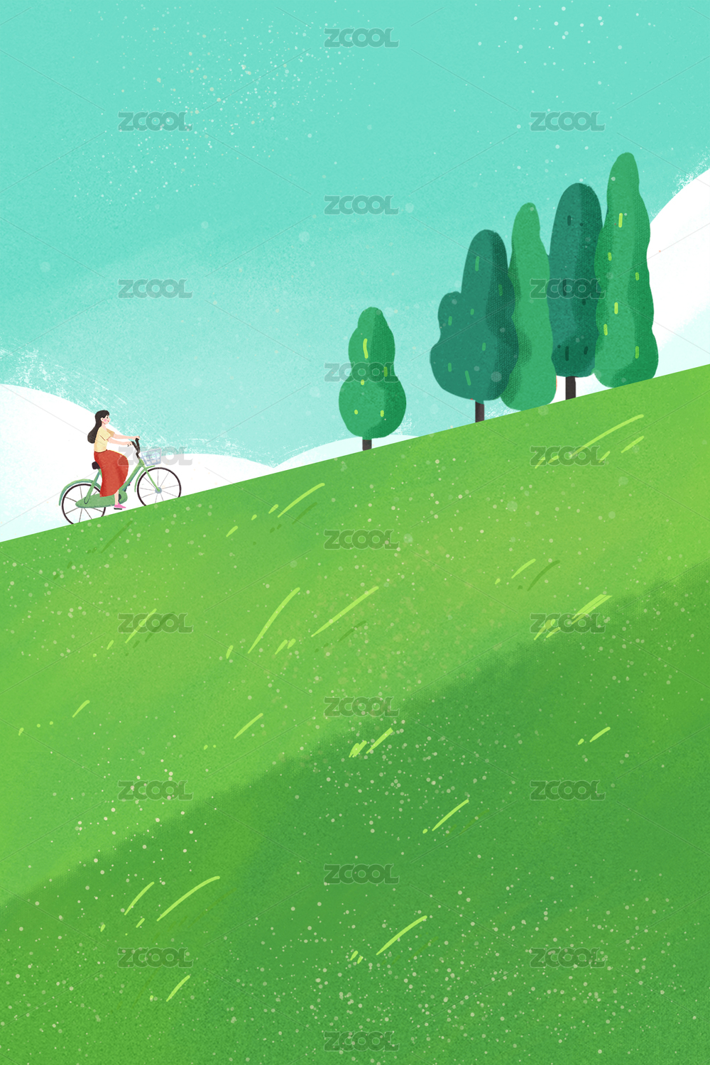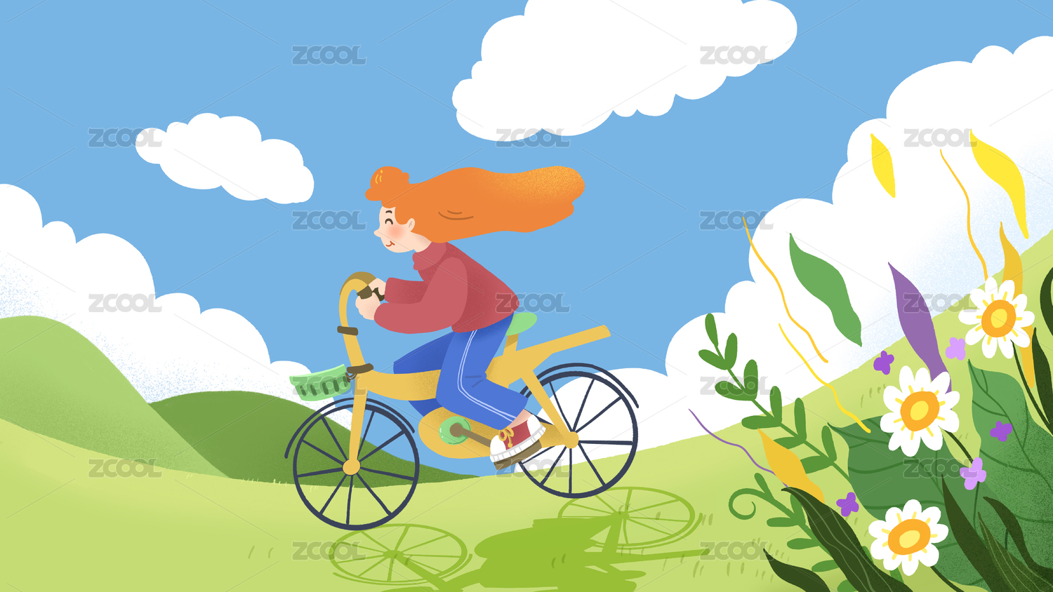 長發(fā)女孩在鄉(xiāng)間小路上騎車踏青氛圍插畫