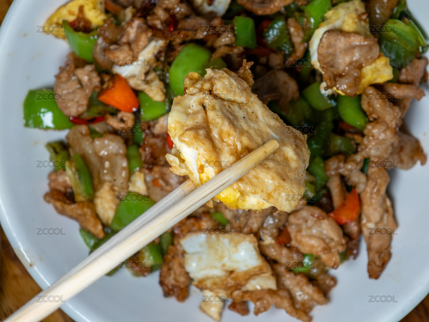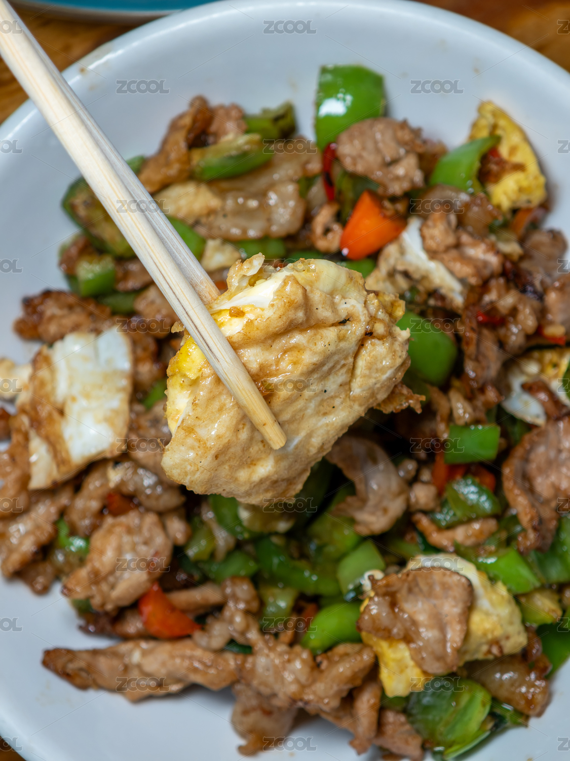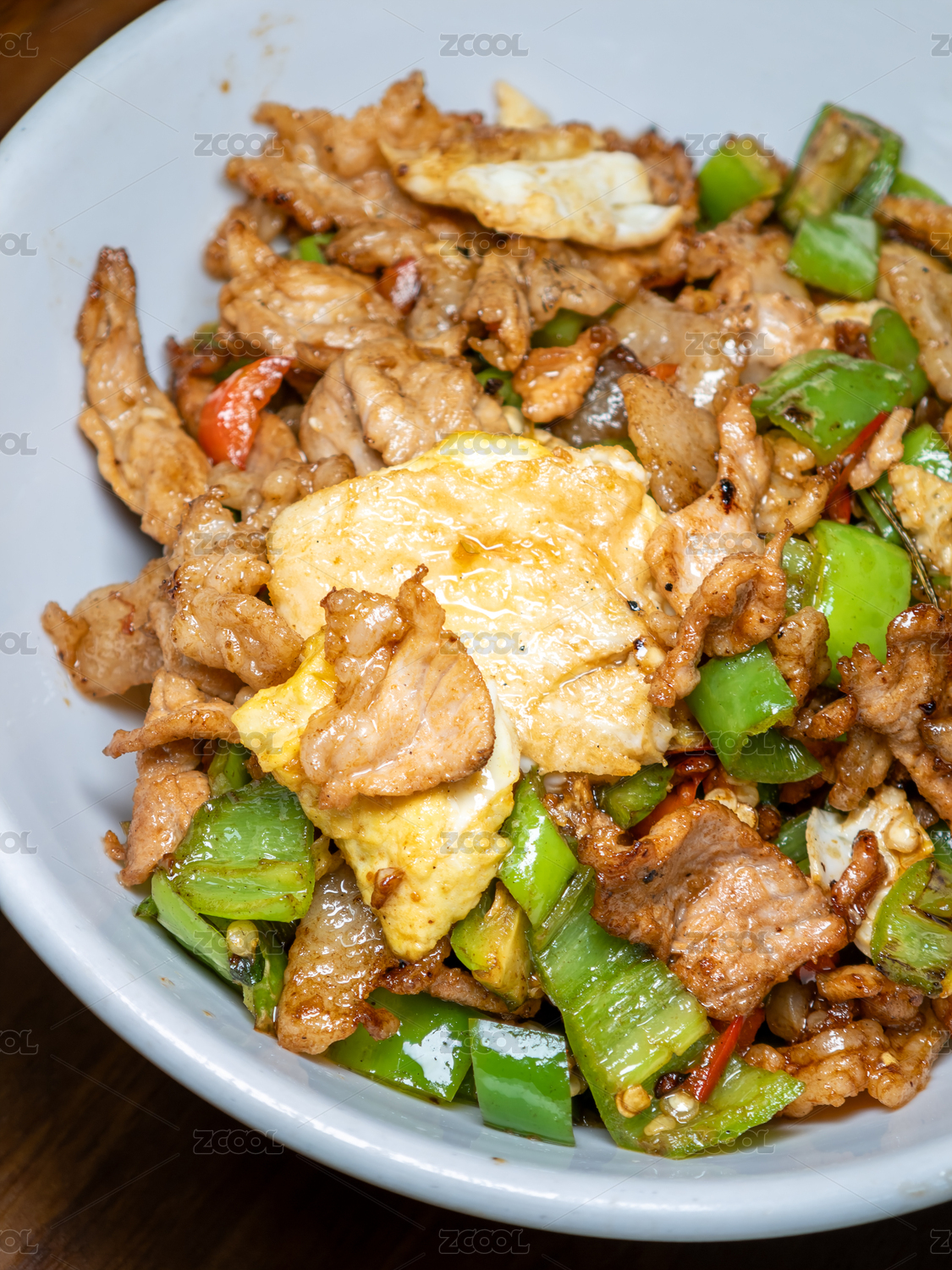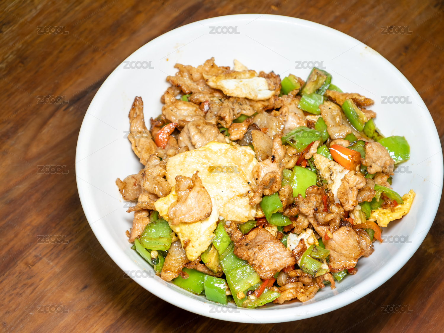 香辣青椒雞蛋炒肉片雞蛋和米飯