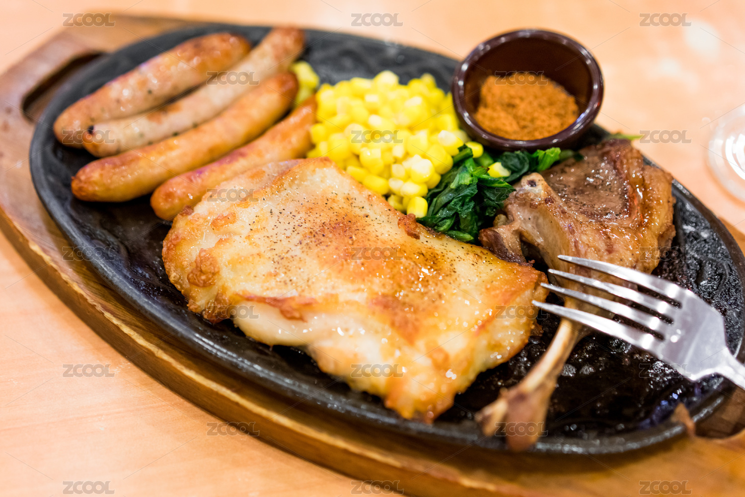 桌面上盤子里的西餐雞扒