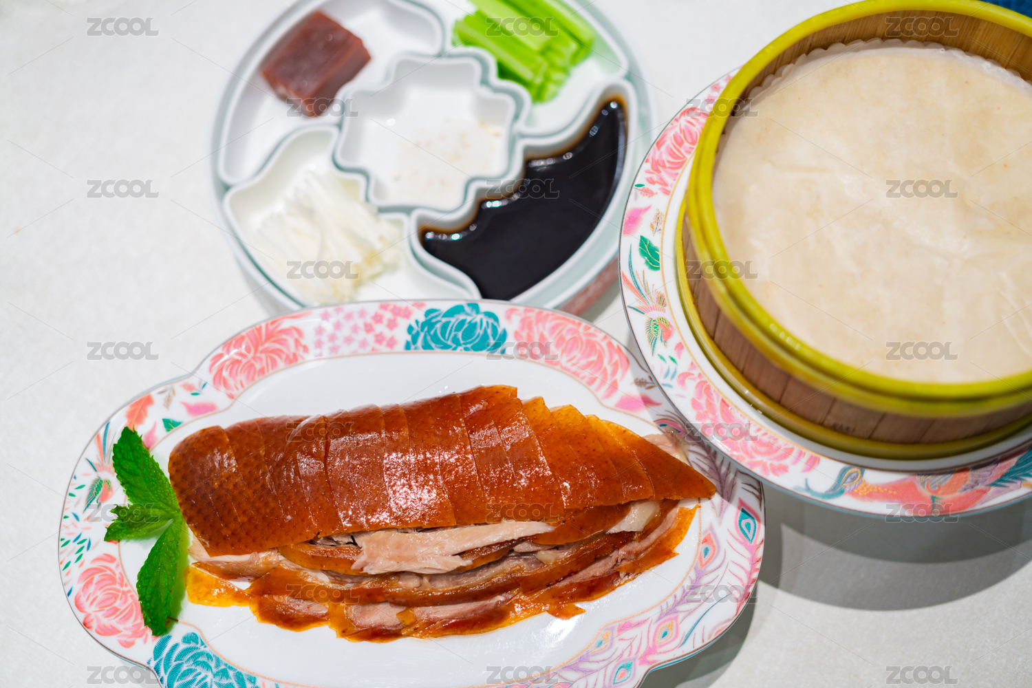 一盤(pán)傳統(tǒng)美食北京烤鴨和蘸料