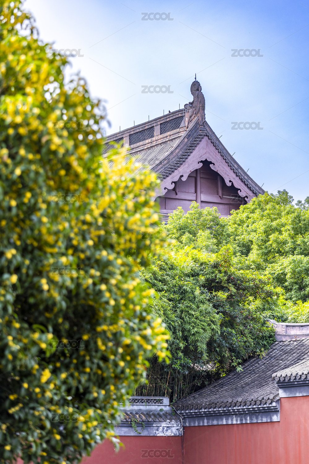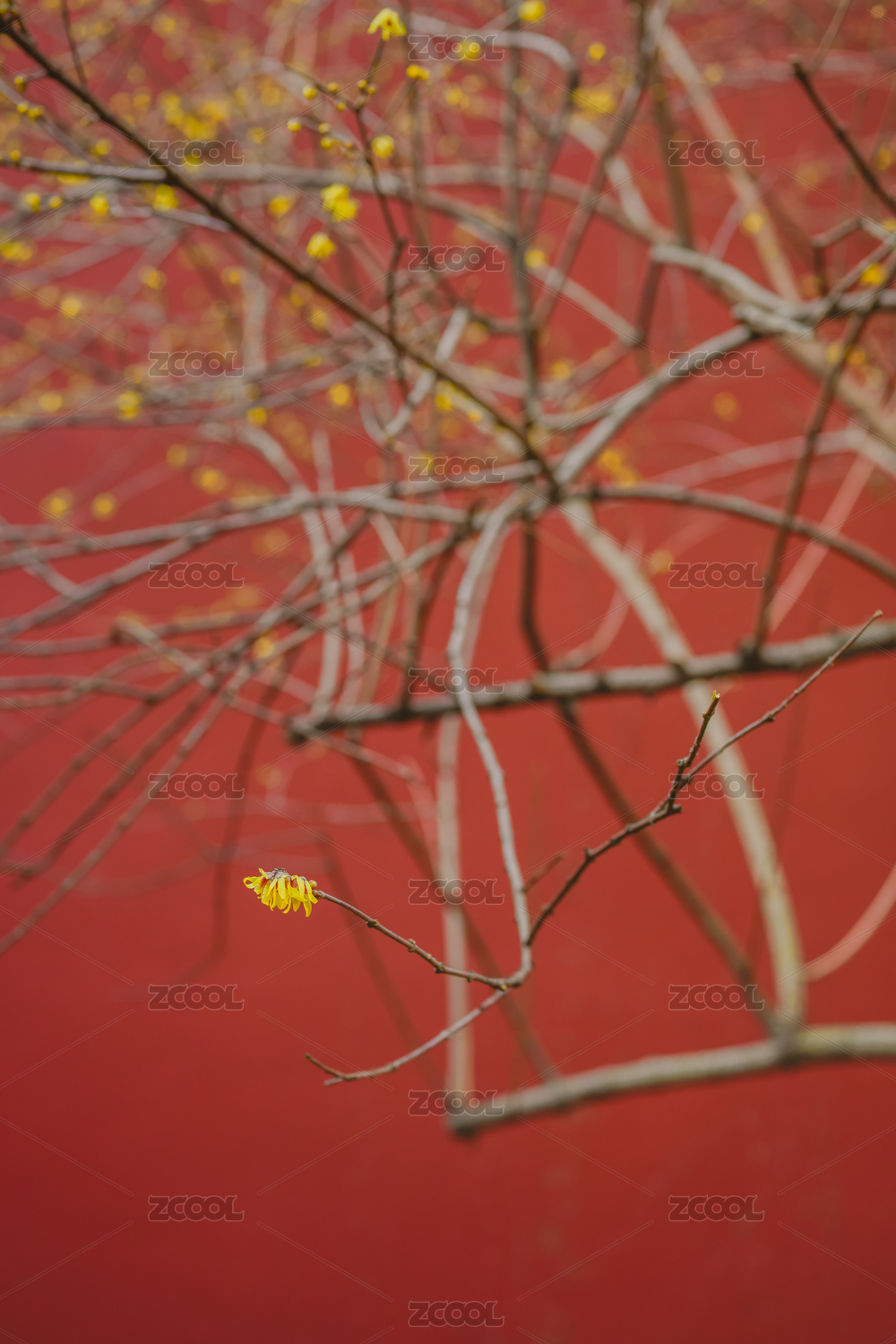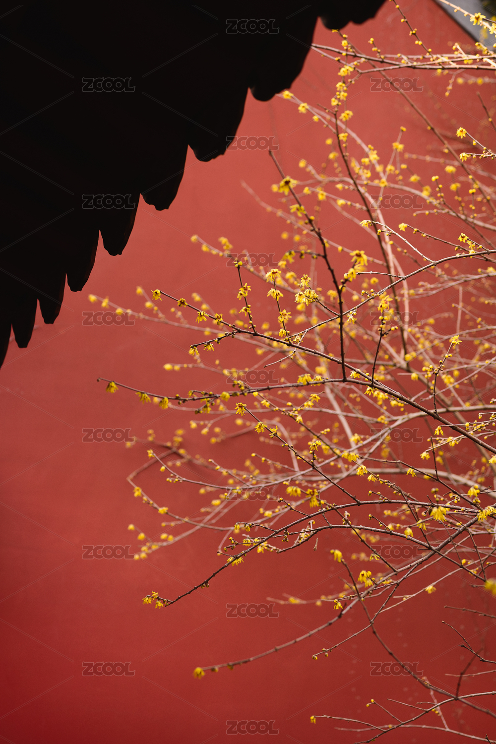 浙江杭州錢王祠的紅色背景黃色臘梅