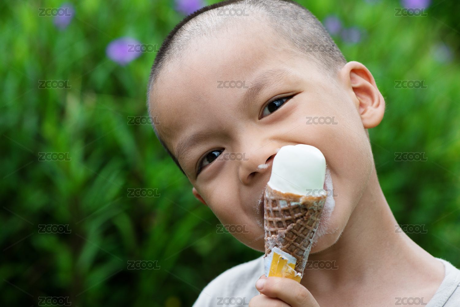 盛夏一名中國男孩吃冰淇淋時的面部表情特寫