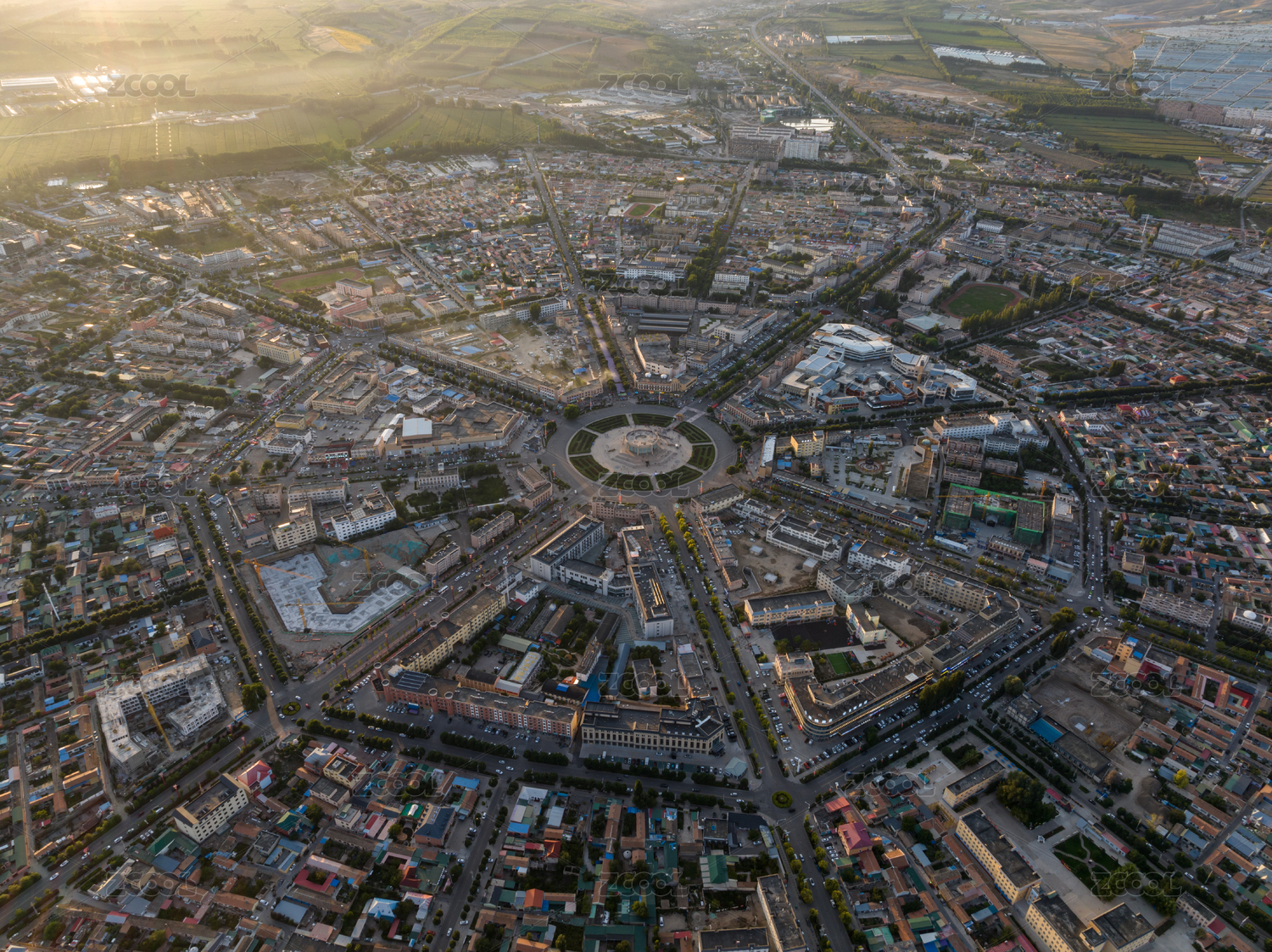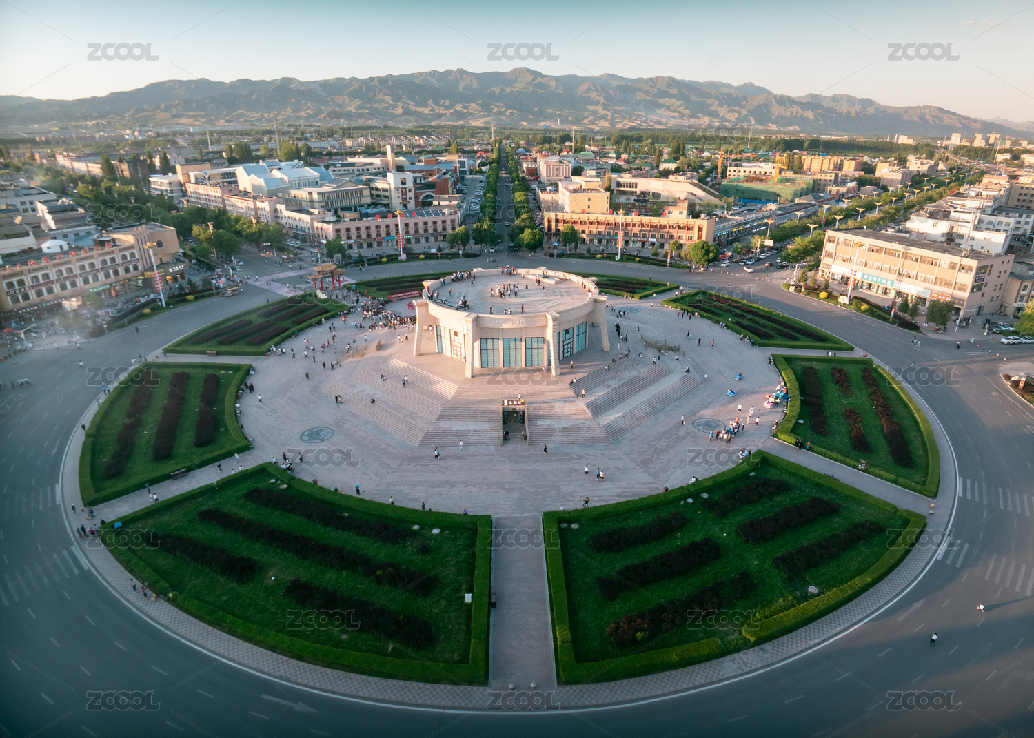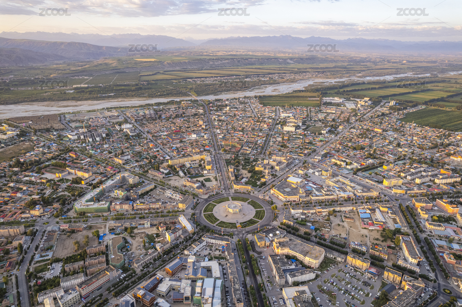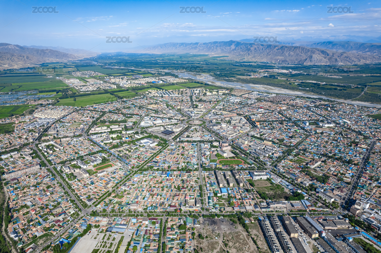 中國新疆伊犁特克斯八卦城航拍城市風(fēng)光
