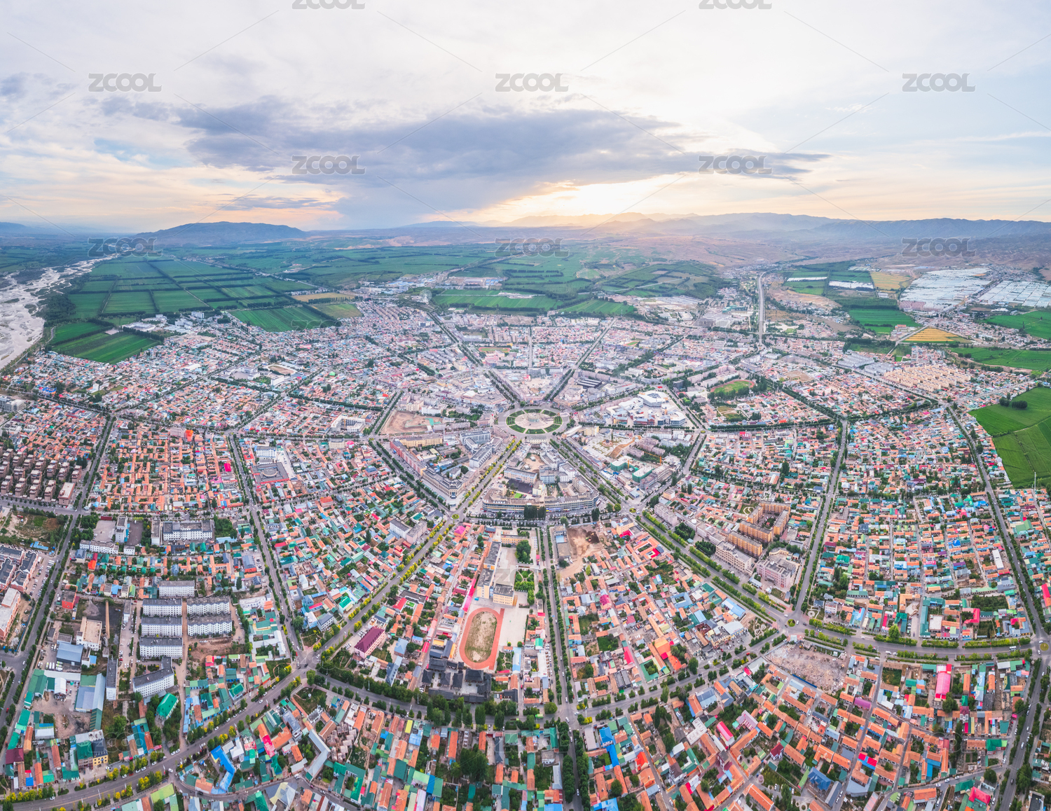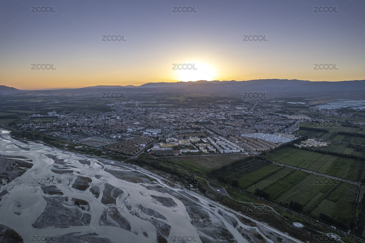 航拍黃昏時(shí)分的中國新疆伊犁特克斯縣八卦城