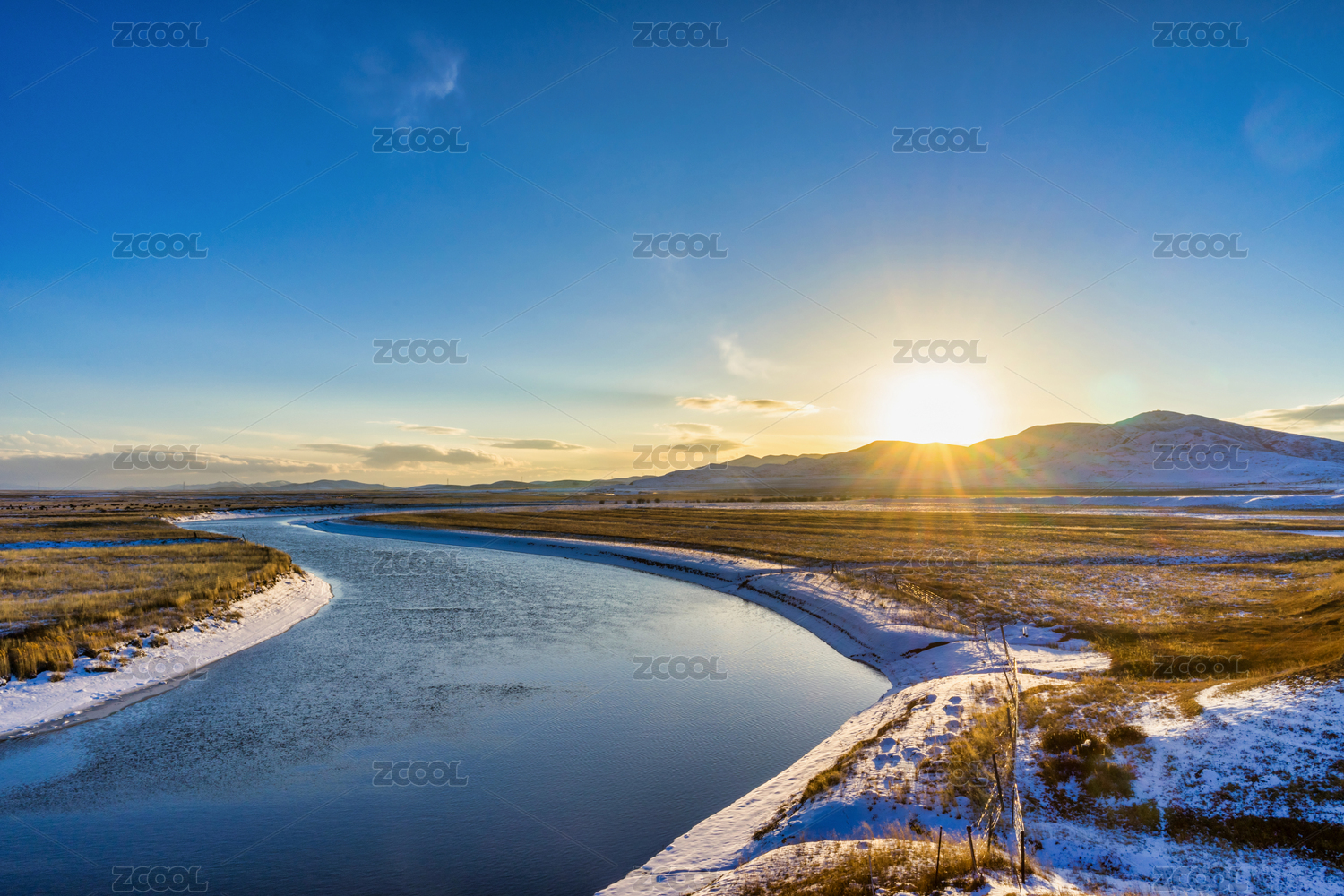中國四川省阿壩州若爾蓋草原黑河冬季雪原夕陽風光