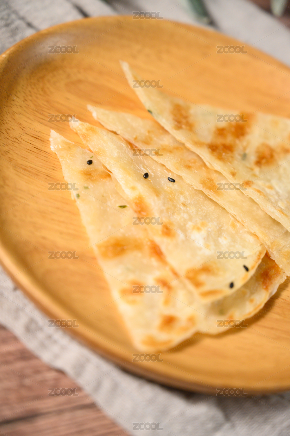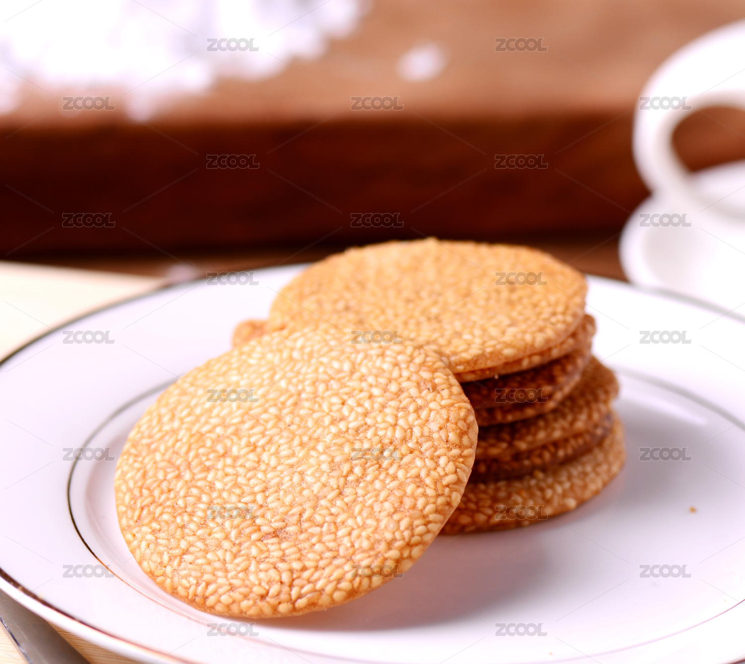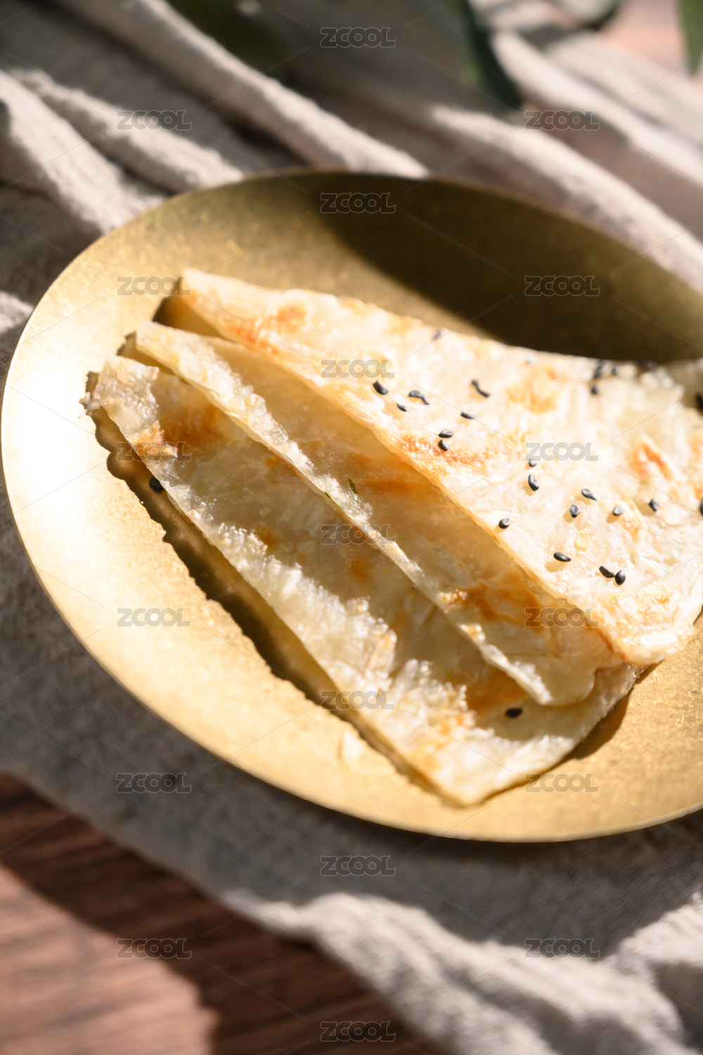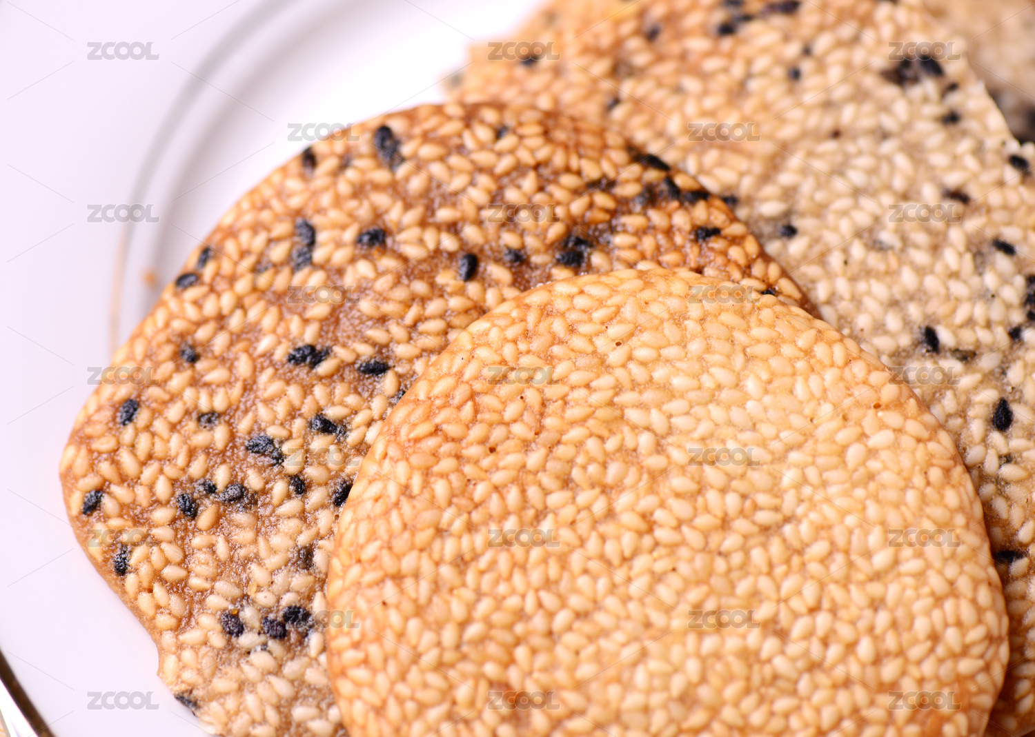 棕色背景下白盤中的芝麻薄餅
