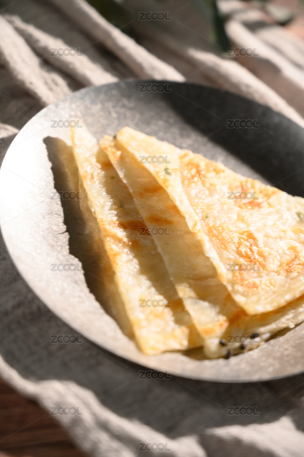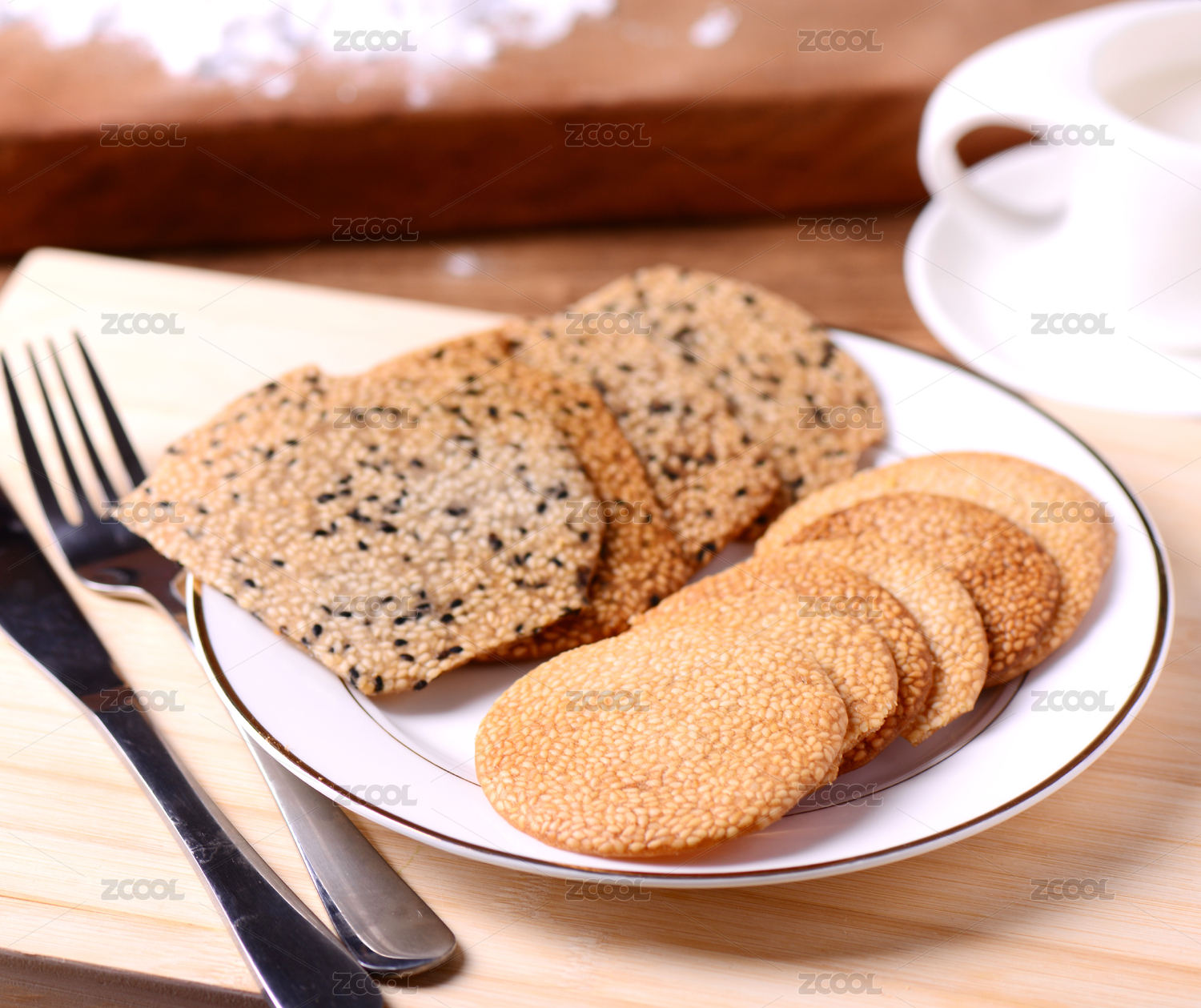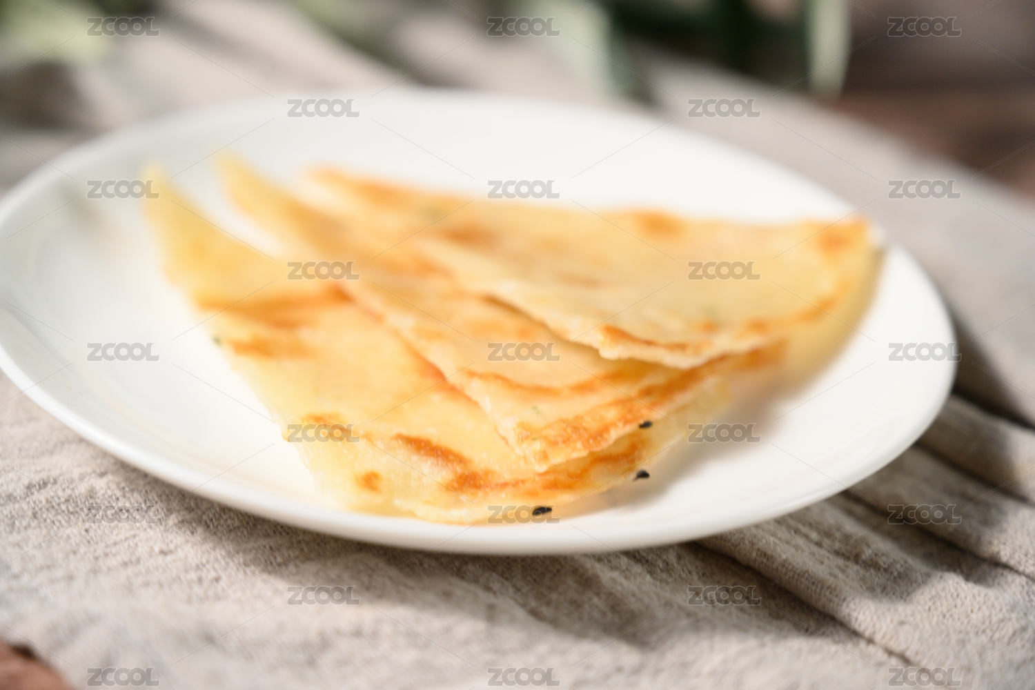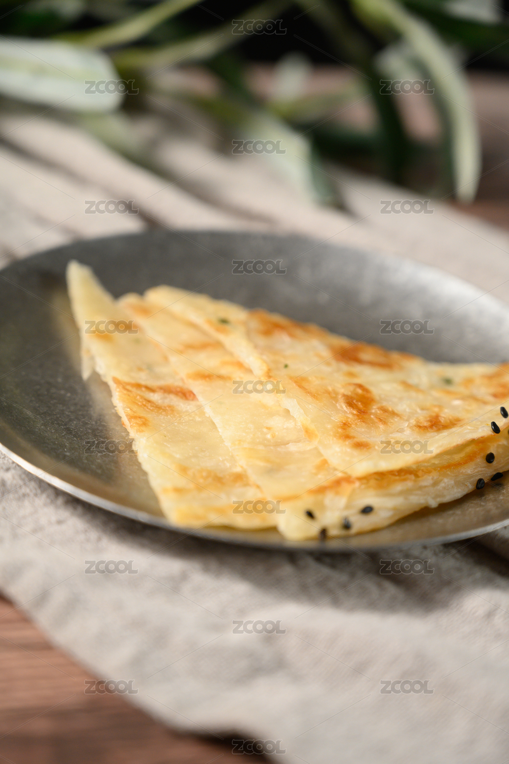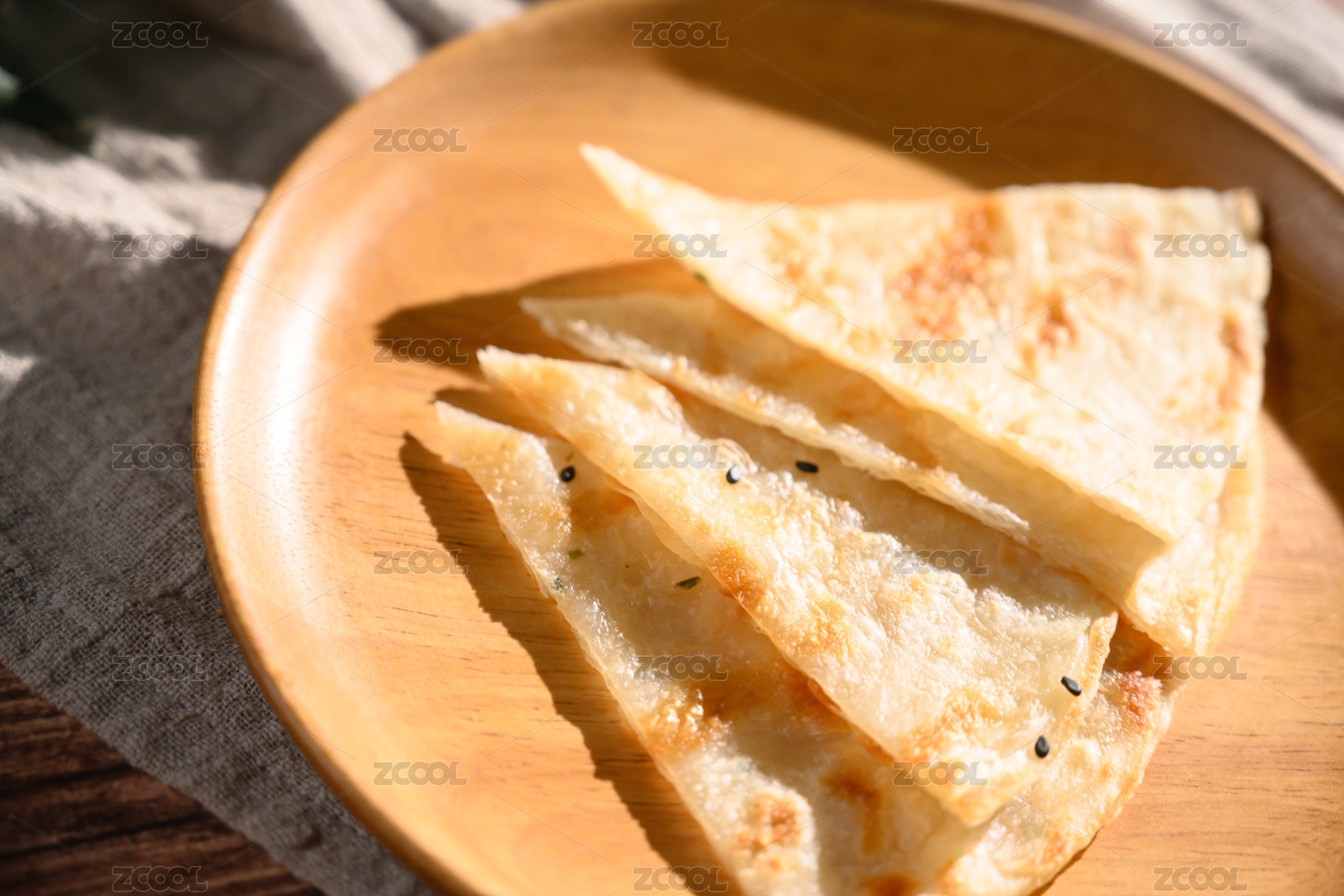 棕色背景下白盤中的芝麻薄餅