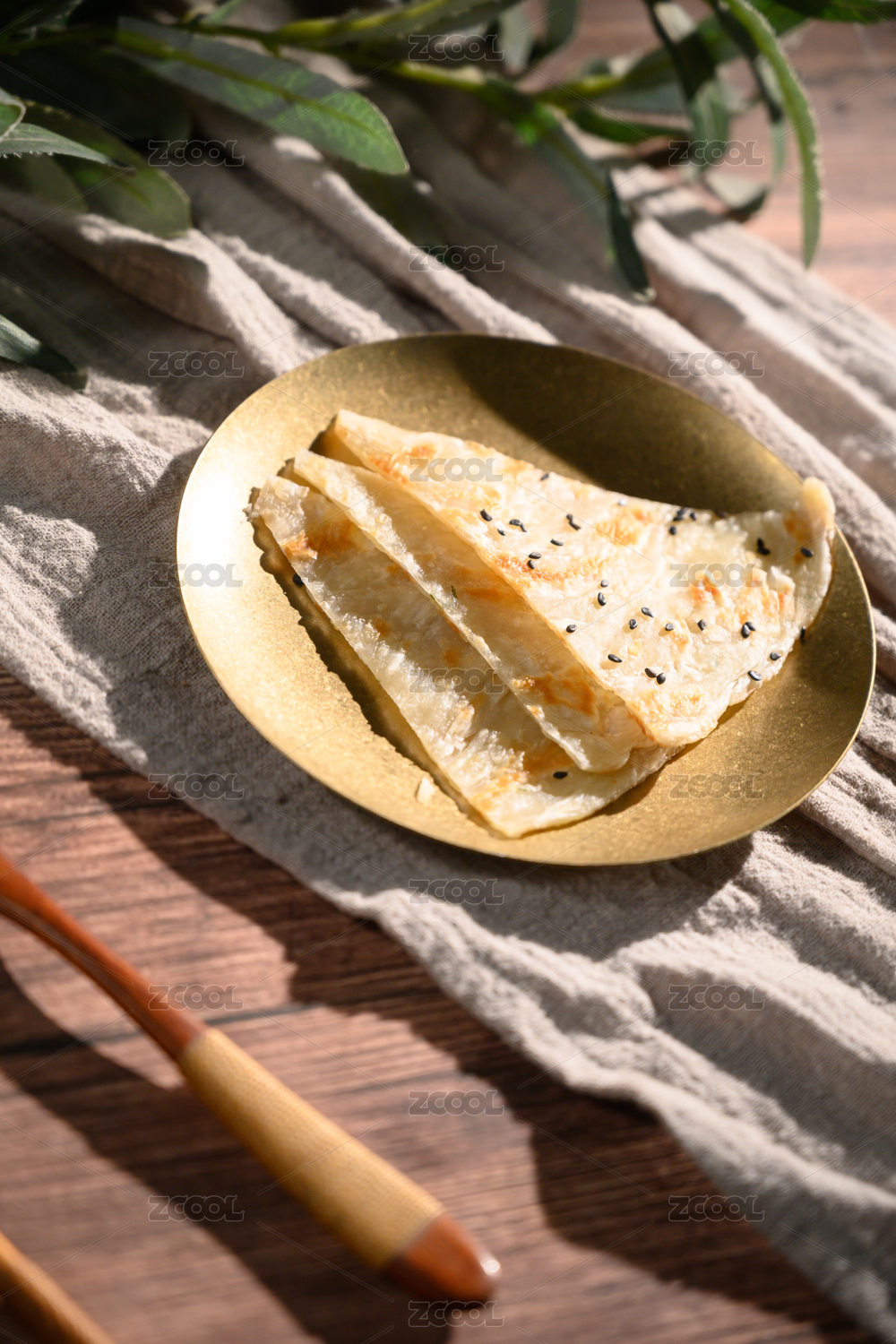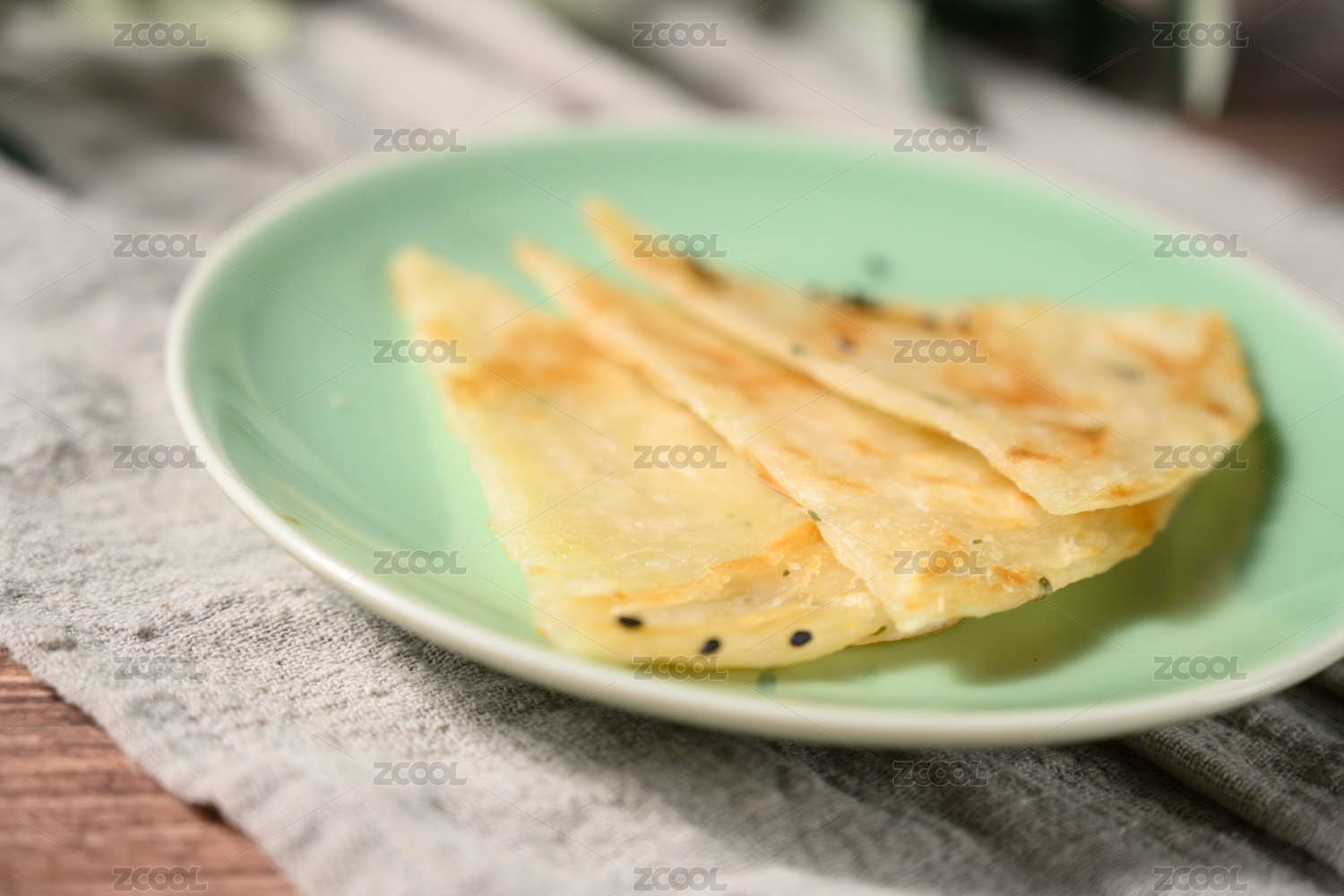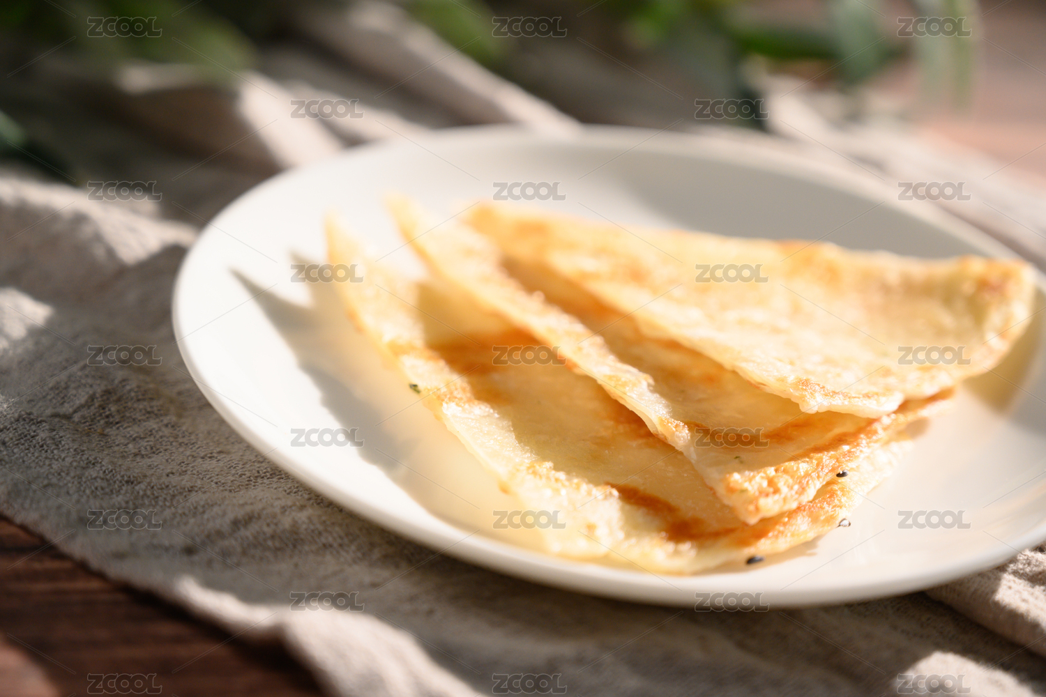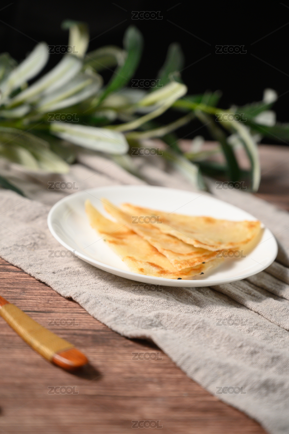 棕色背景下白盤中的芝麻薄餅