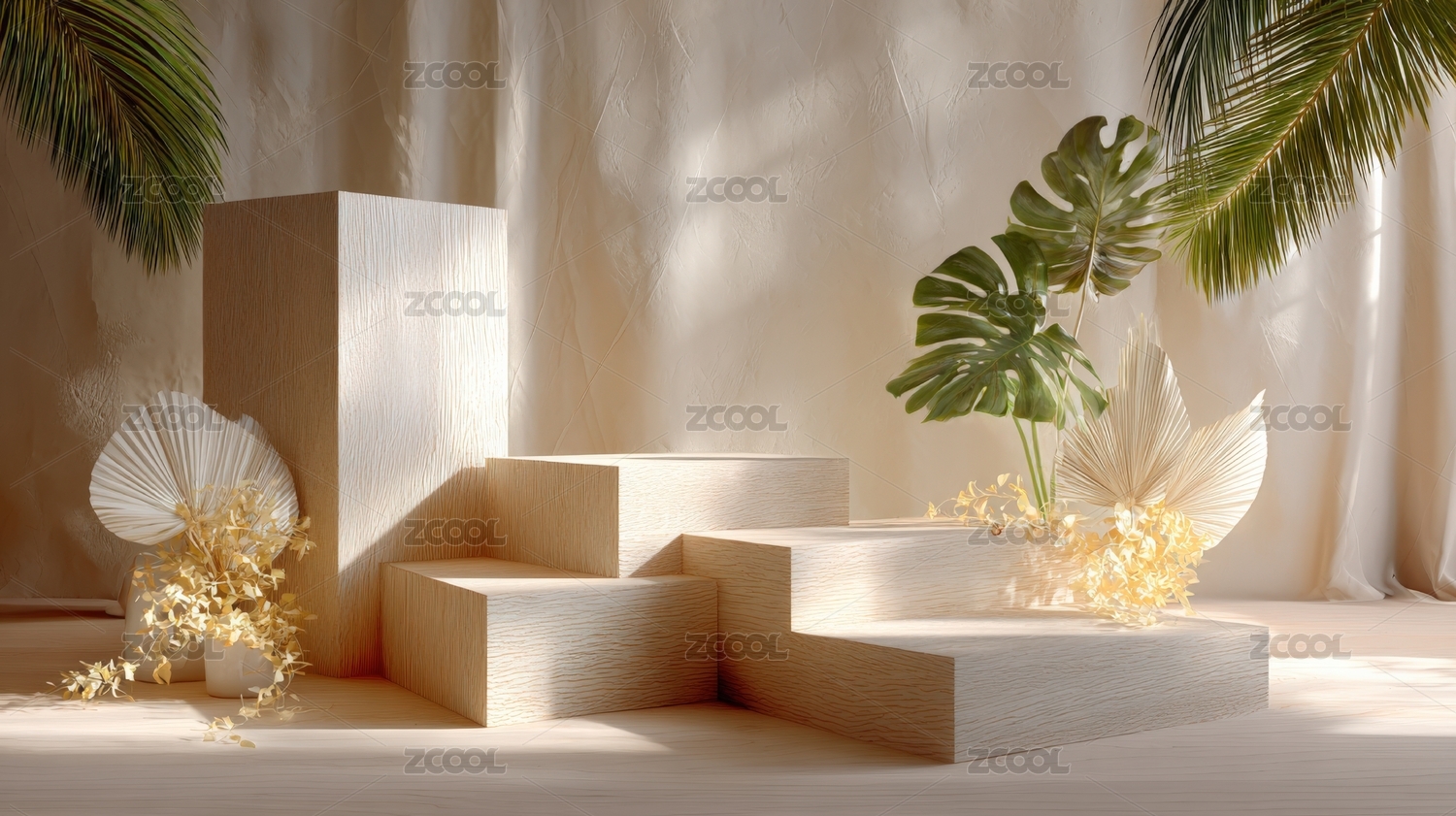 時尚的木質(zhì)階梯陳列臺與植物裝飾