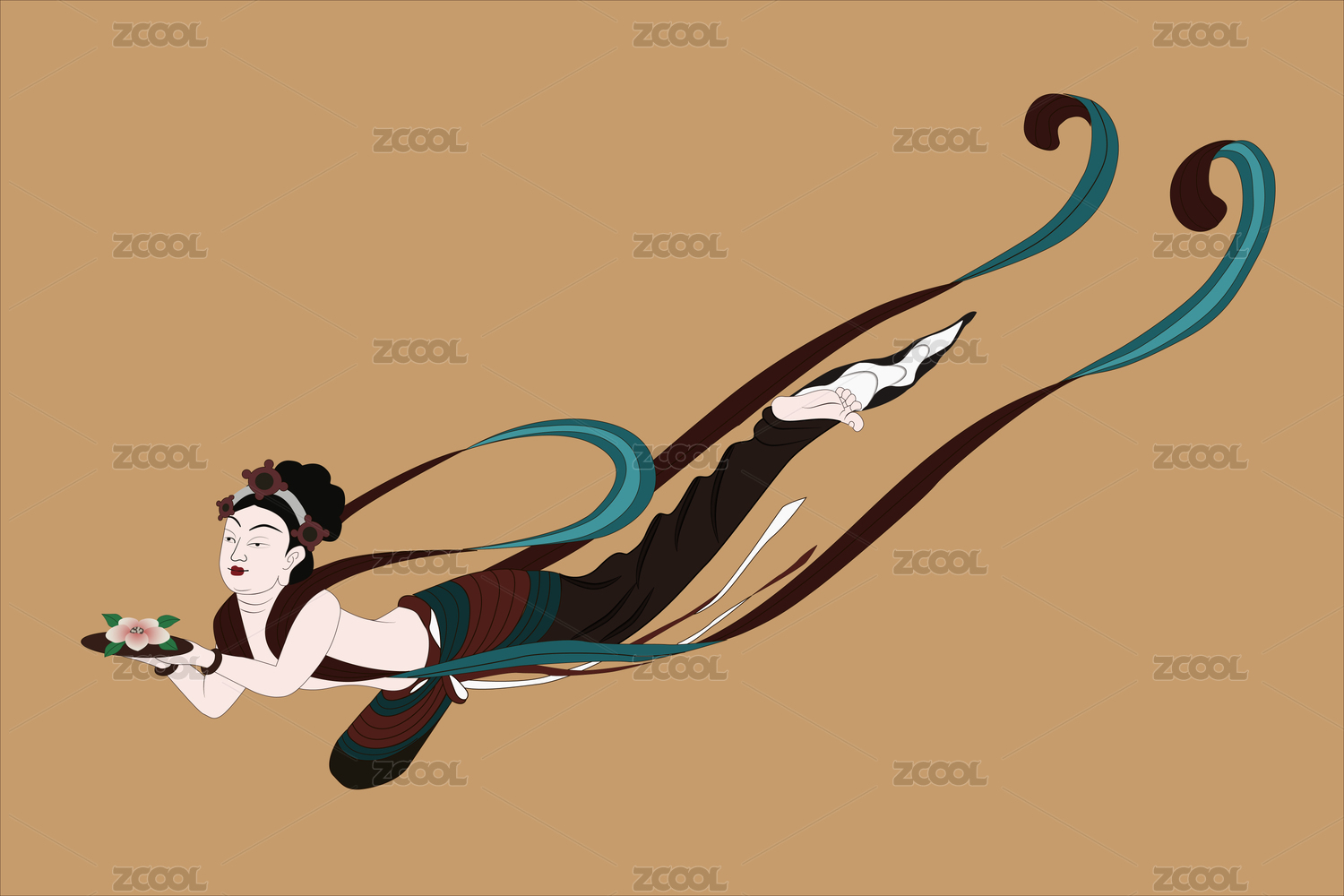 敦煌壁畫手拿托盤和花飛天可無限放大矢量圖