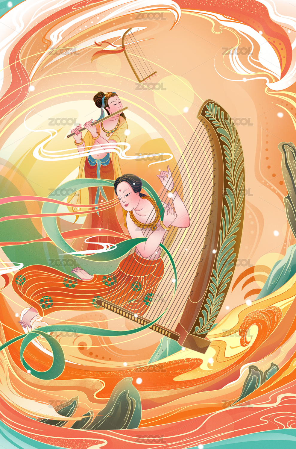 敦煌壁畫風(fēng)格樂伎仕女圖矢量插畫