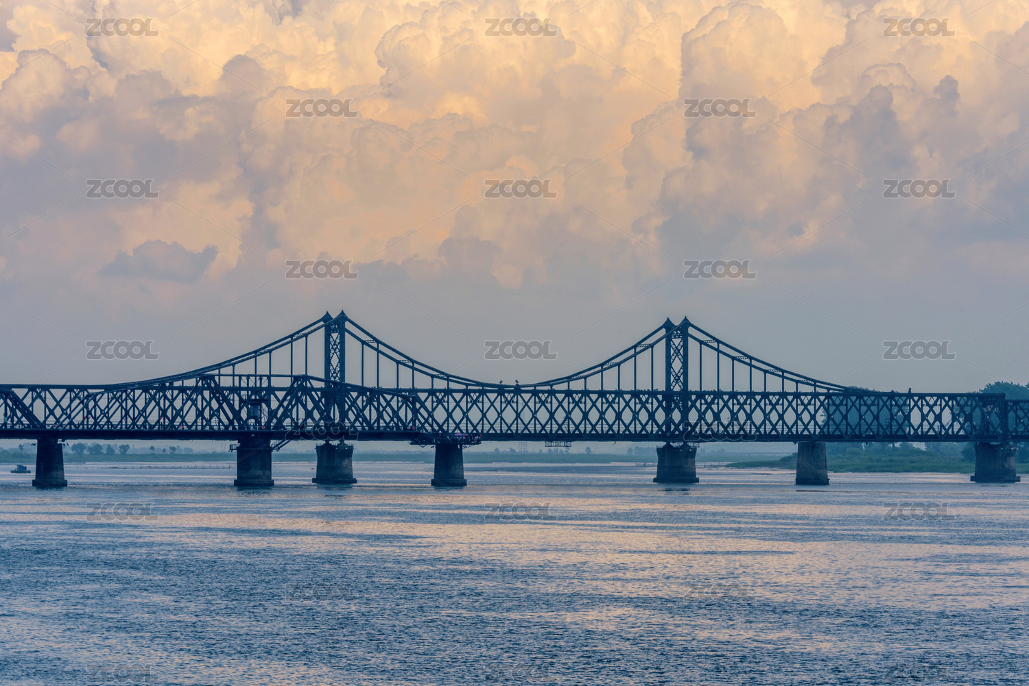 中國(guó)東北遼寧丹東鴨綠江斷橋上空升起紅色云彩