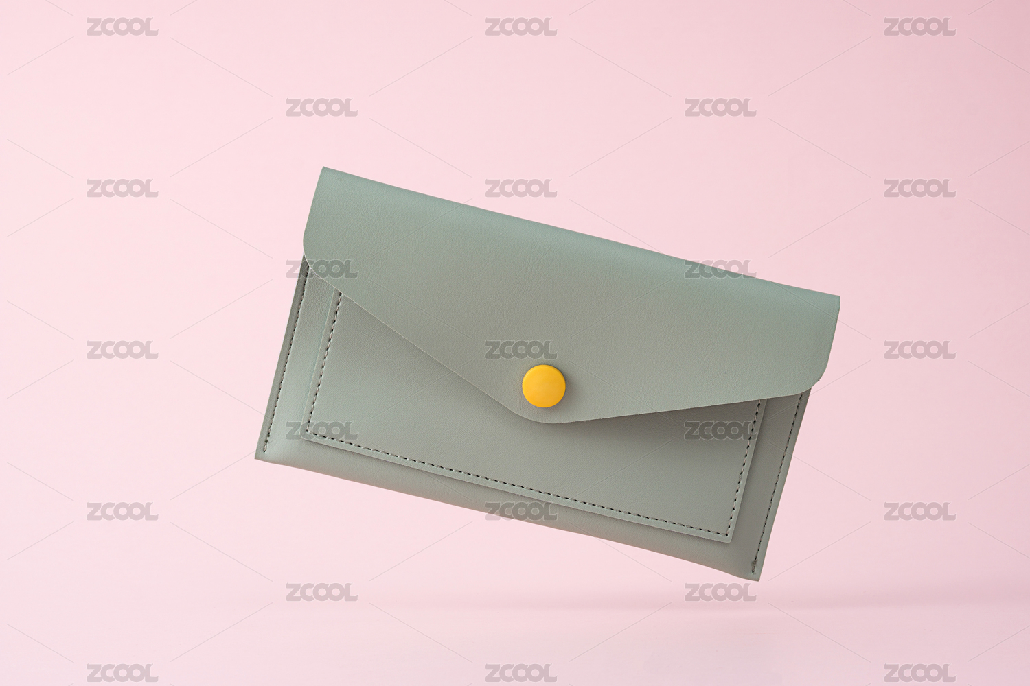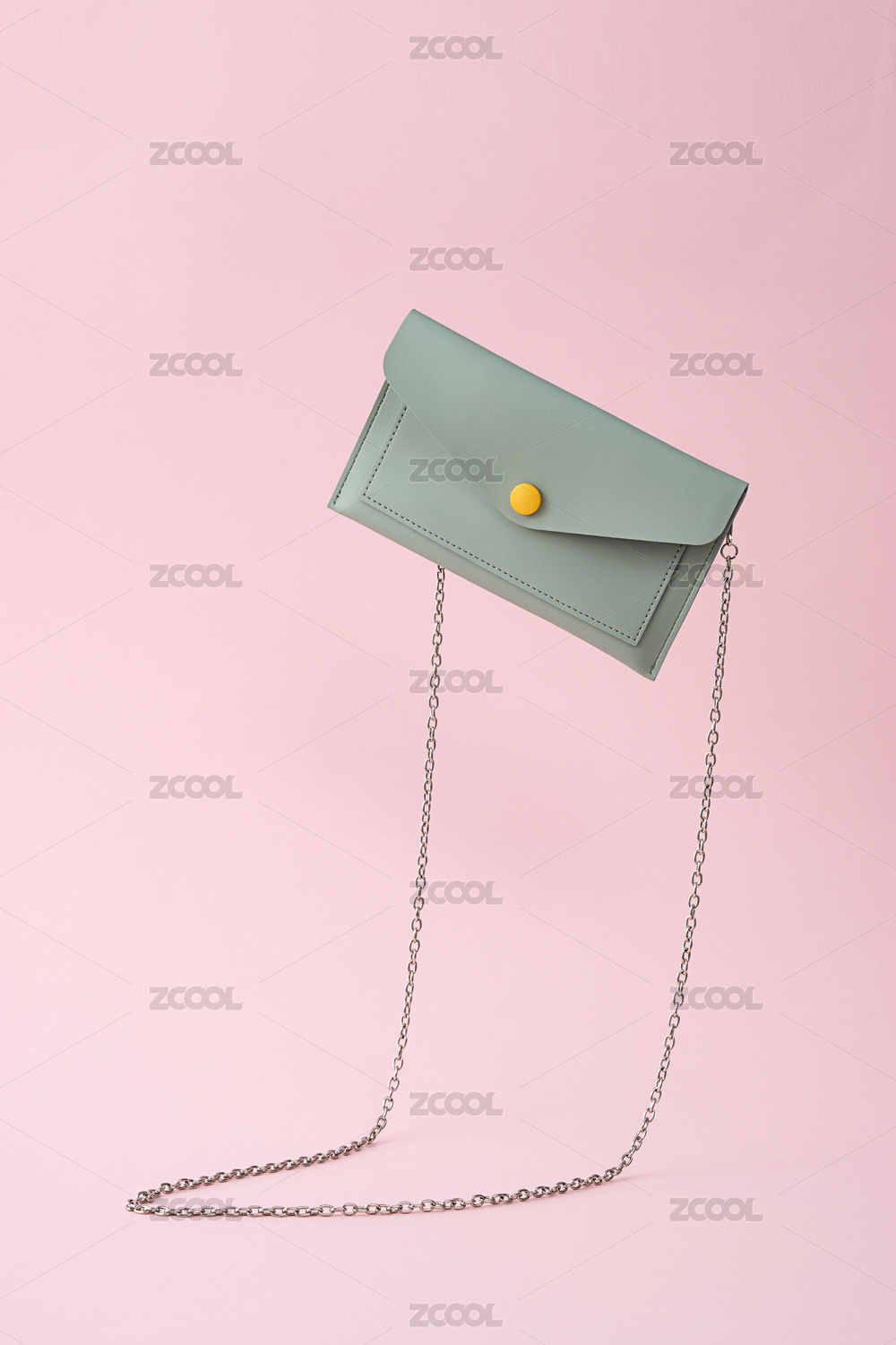 粉色背景前,掉落的綠色時尚小皮包