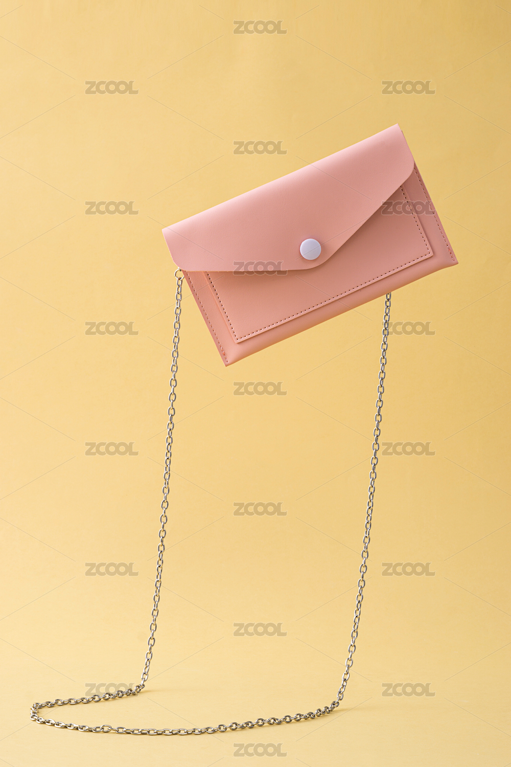 黃色背景前,掉落的粉色皮質(zhì)小挎包