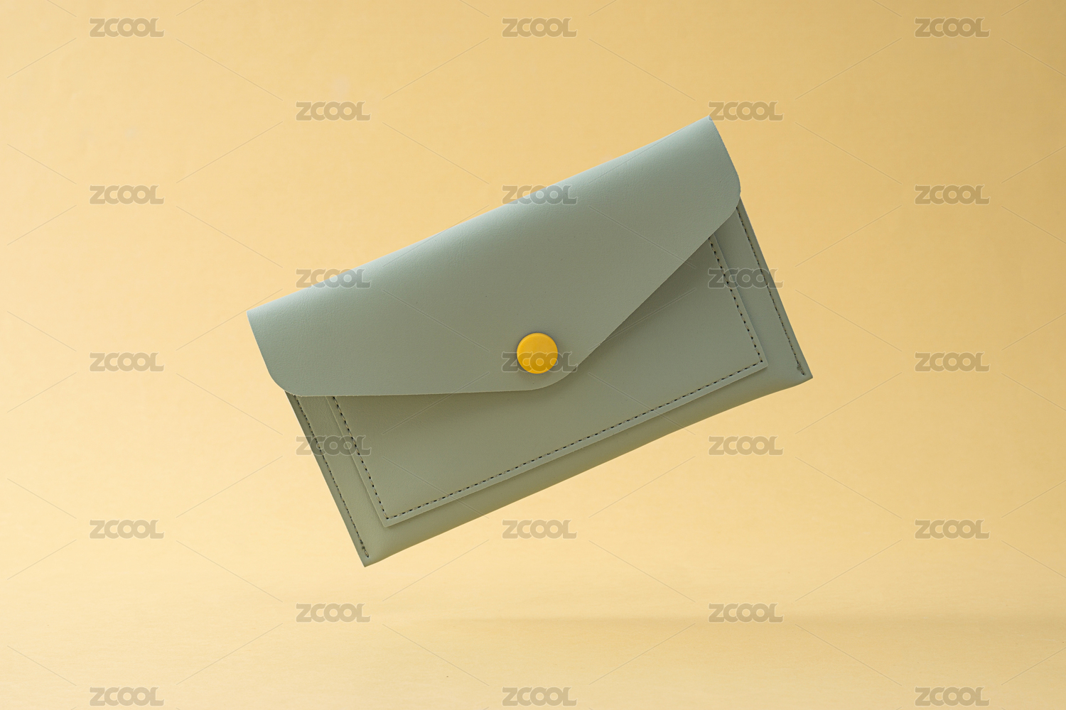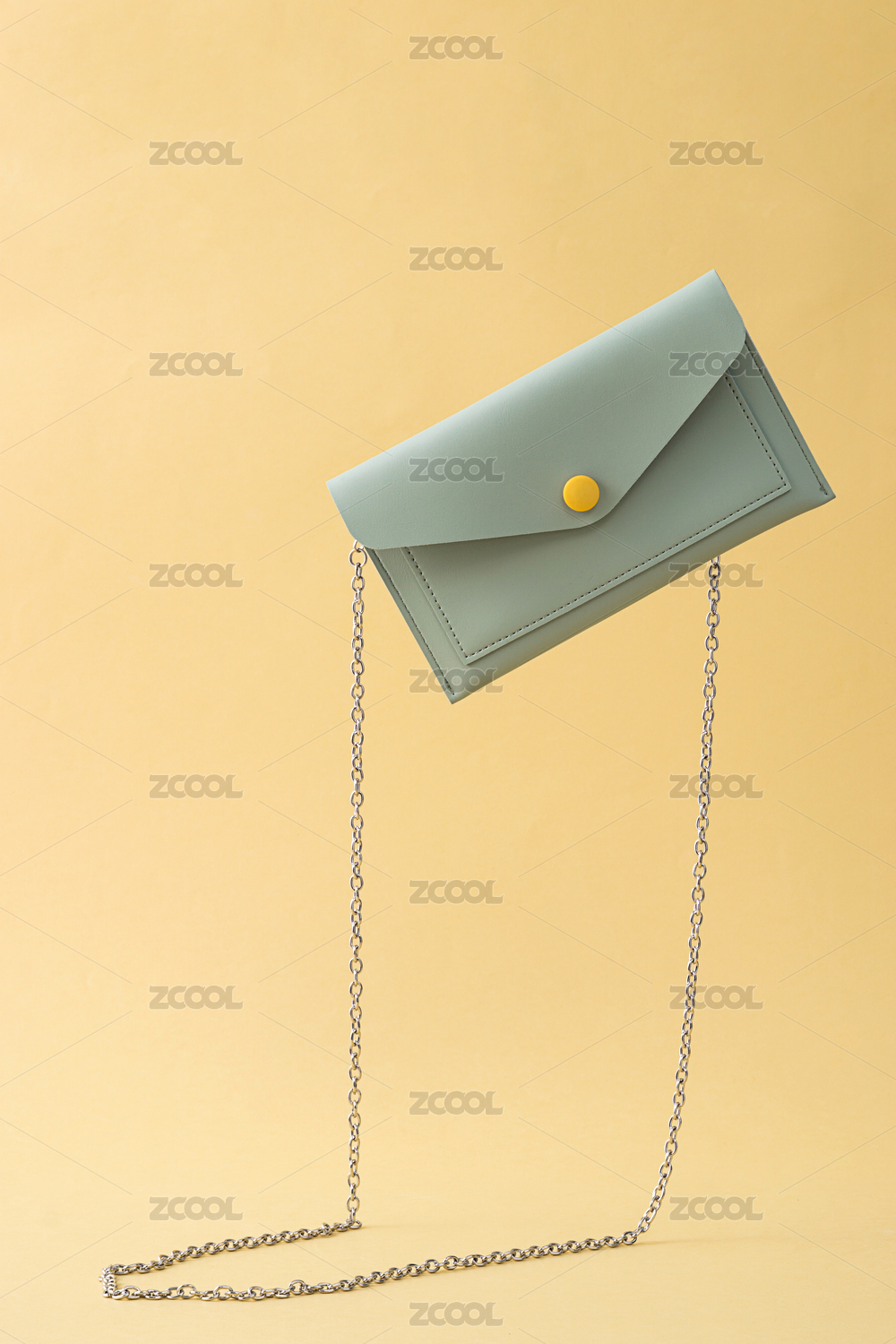 黃色背景前,掉落的綠色皮質(zhì)小挎包