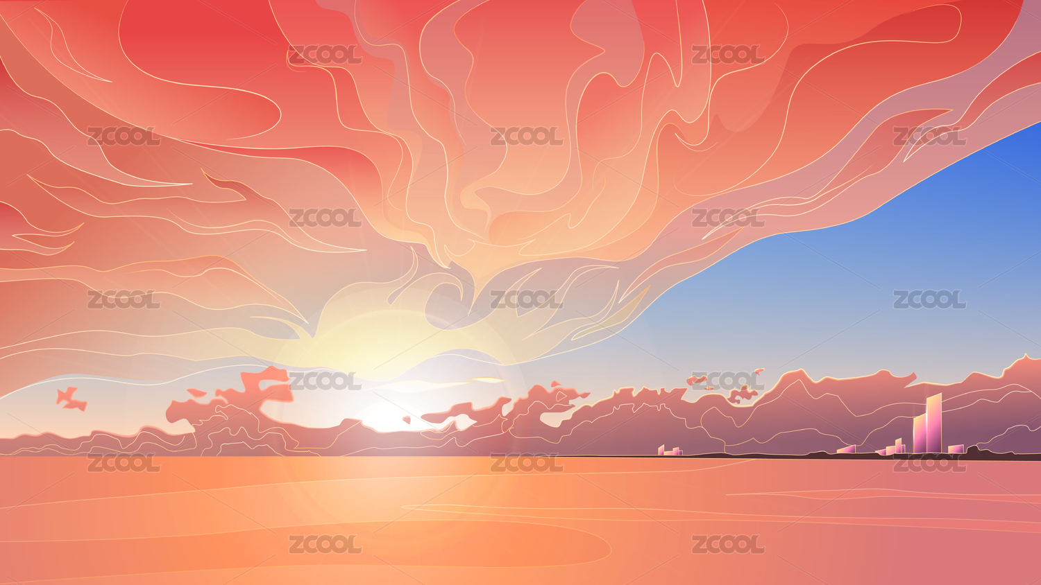 如火的夕陽和余暉中的建筑物矢量圖