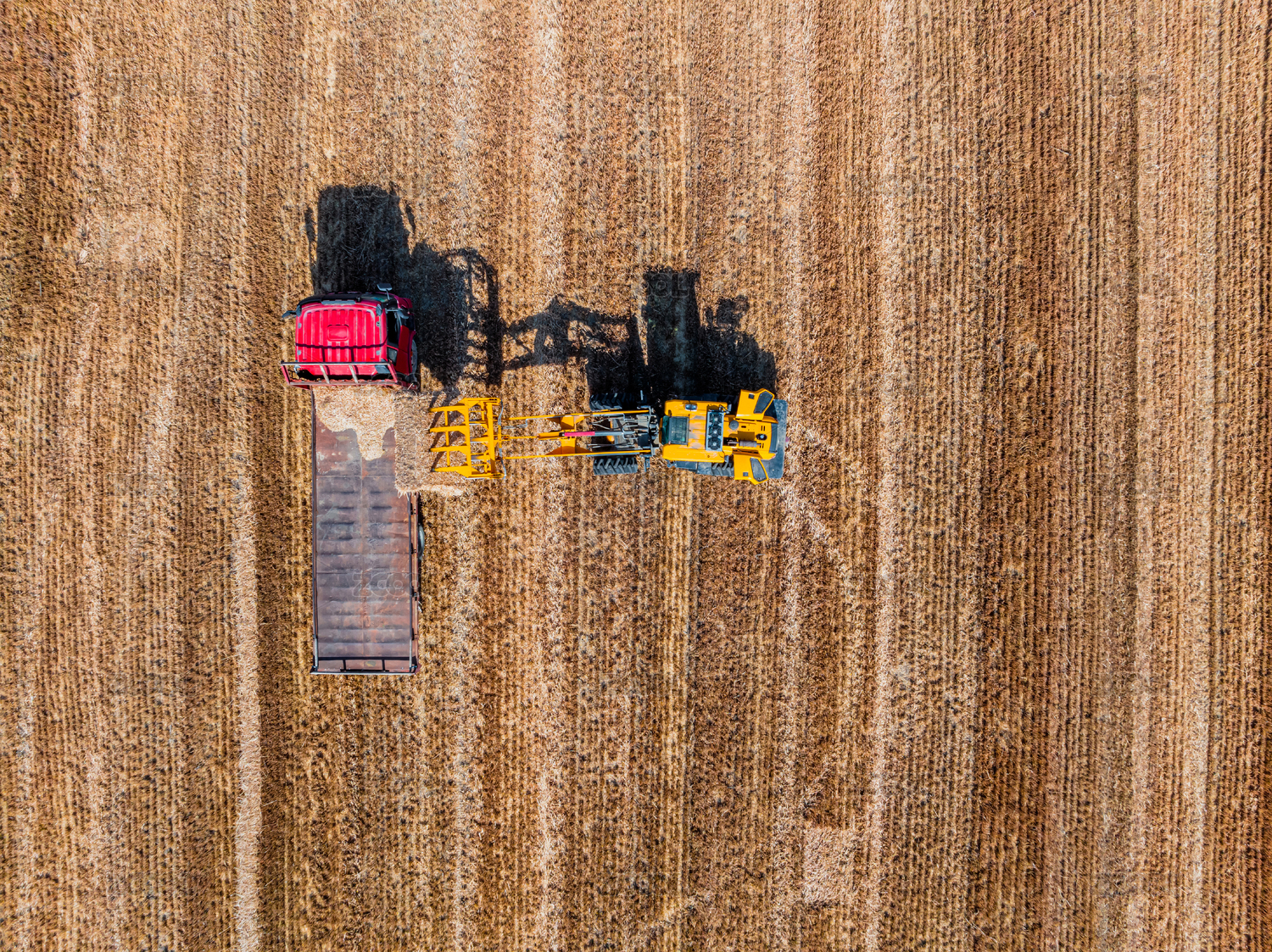 航拍農用拖拉機往卡車上裝載小麥秸稈